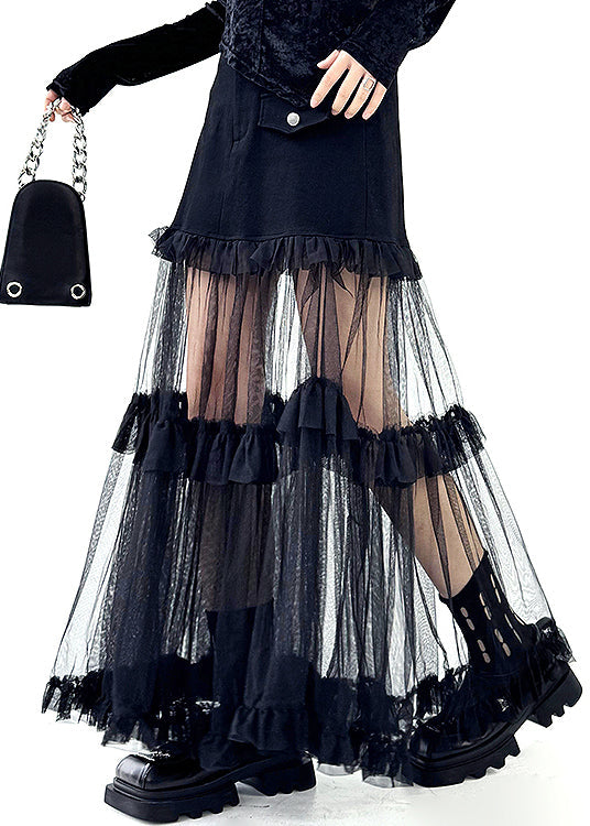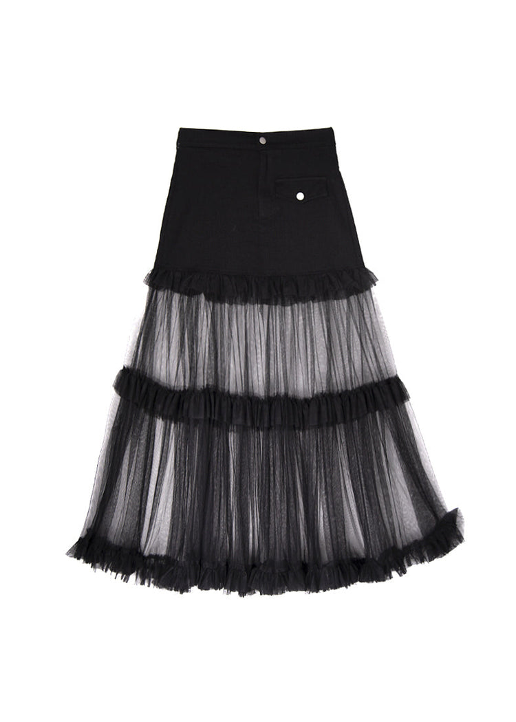 Original Design Black Ruffled Tulle Patchwork Denim Skirt Summer