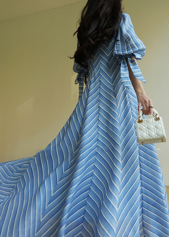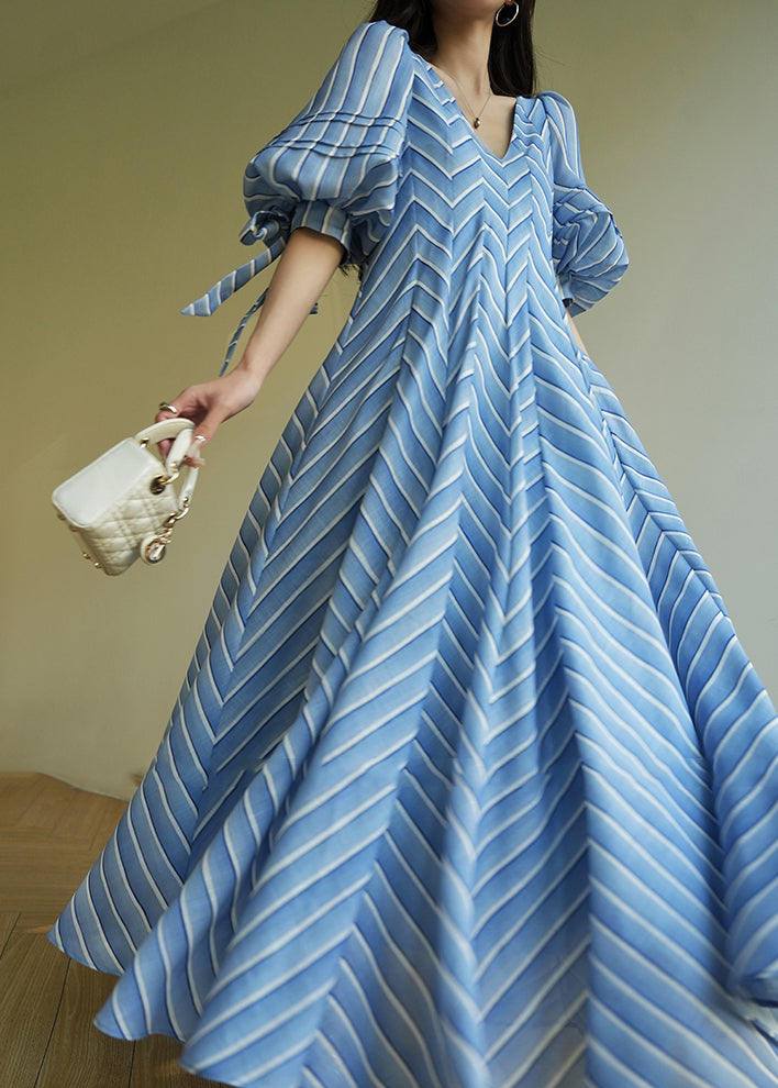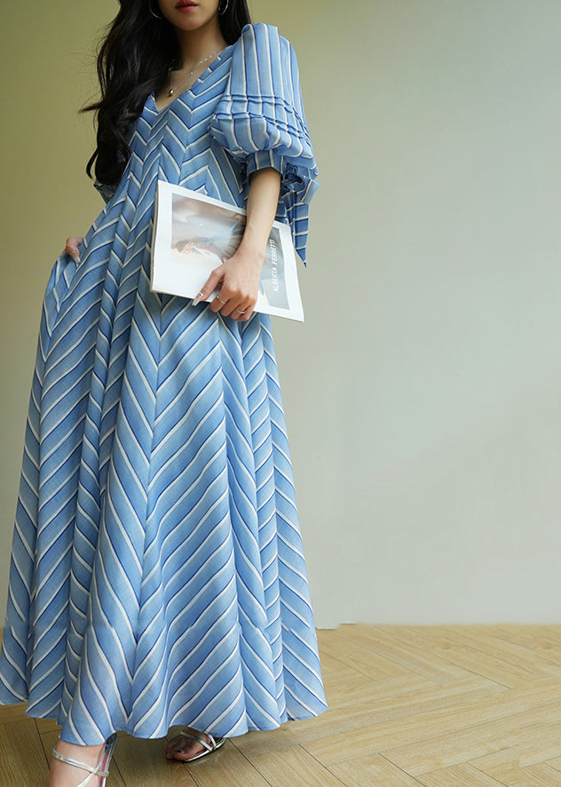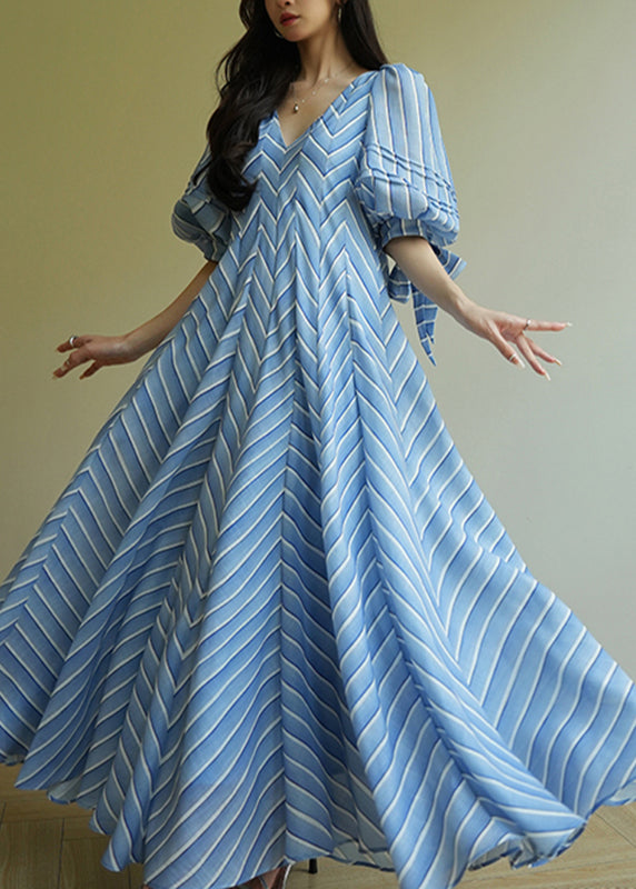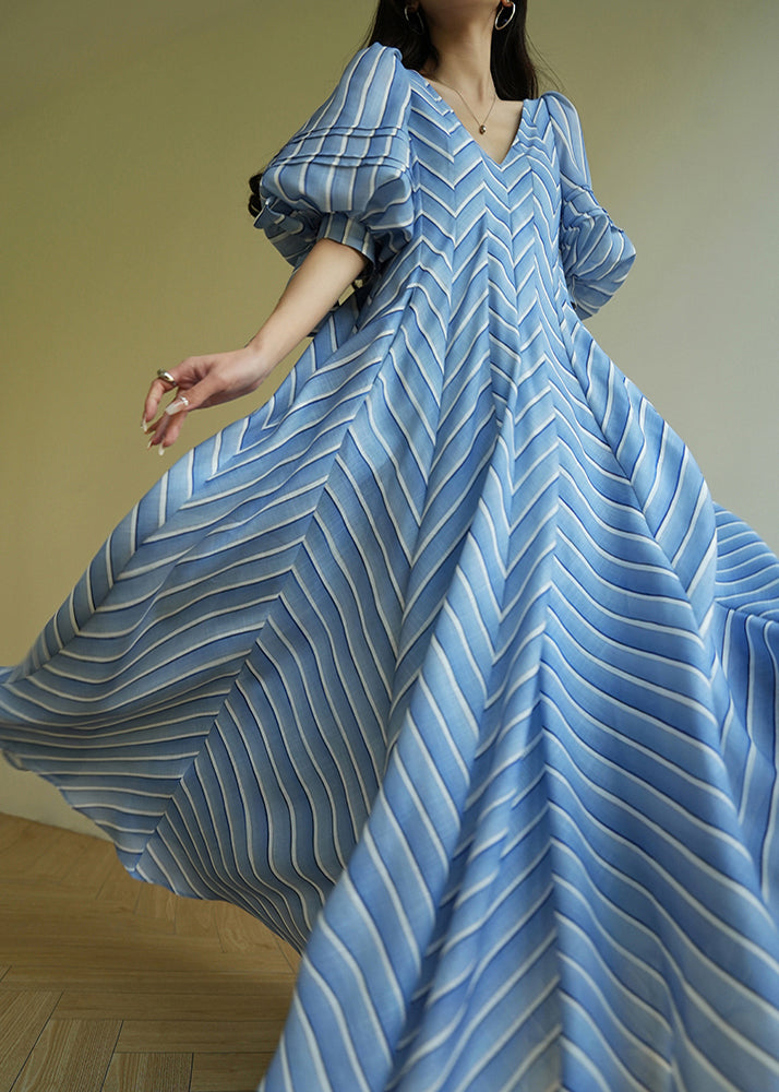 Original Design Blue V Neck Striped Long Dresses Short Sleeve