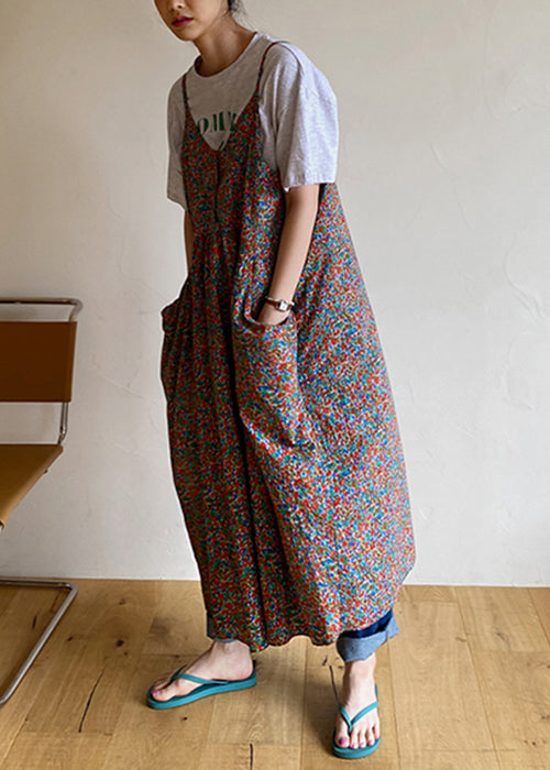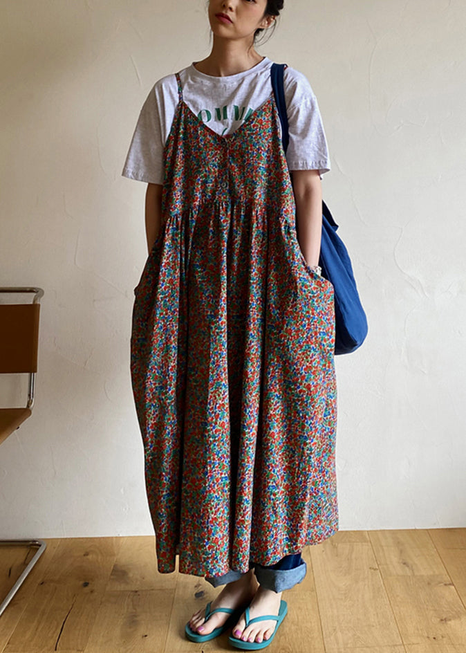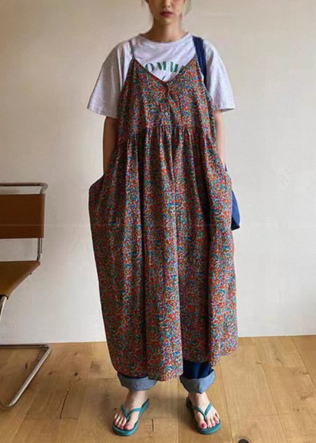 Red Button Print Cotton Sleeveless Spaghetti Strap Dress V Neck