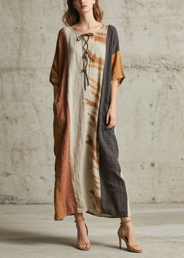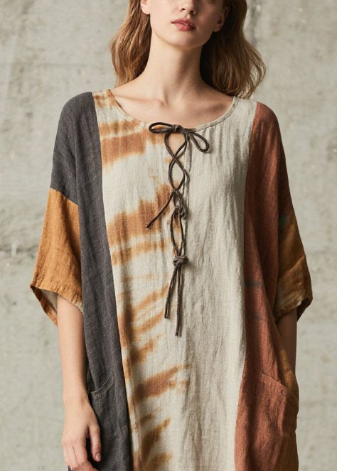 Retro Brown Oversized Patchwork Cotton Holiday Dress Summer