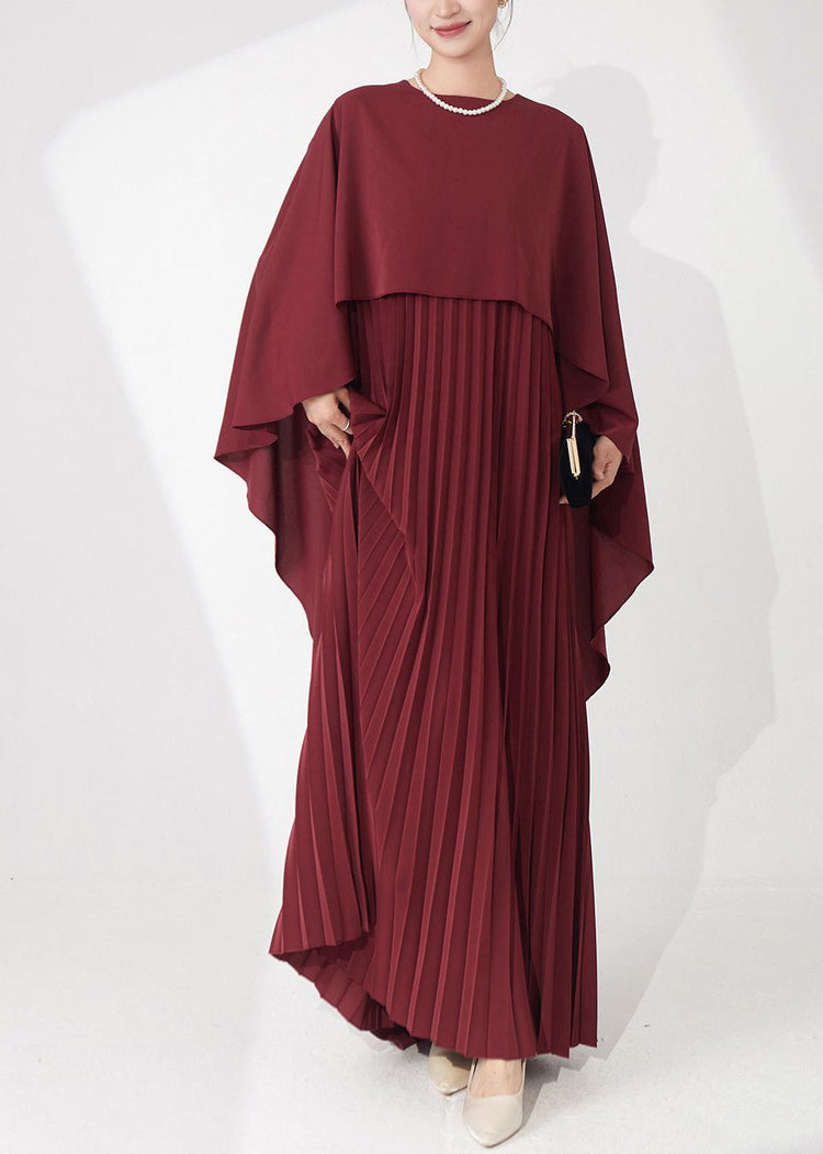 Retro Elegance Burgundy Cape-Style Pleated Dinner Gown Fall