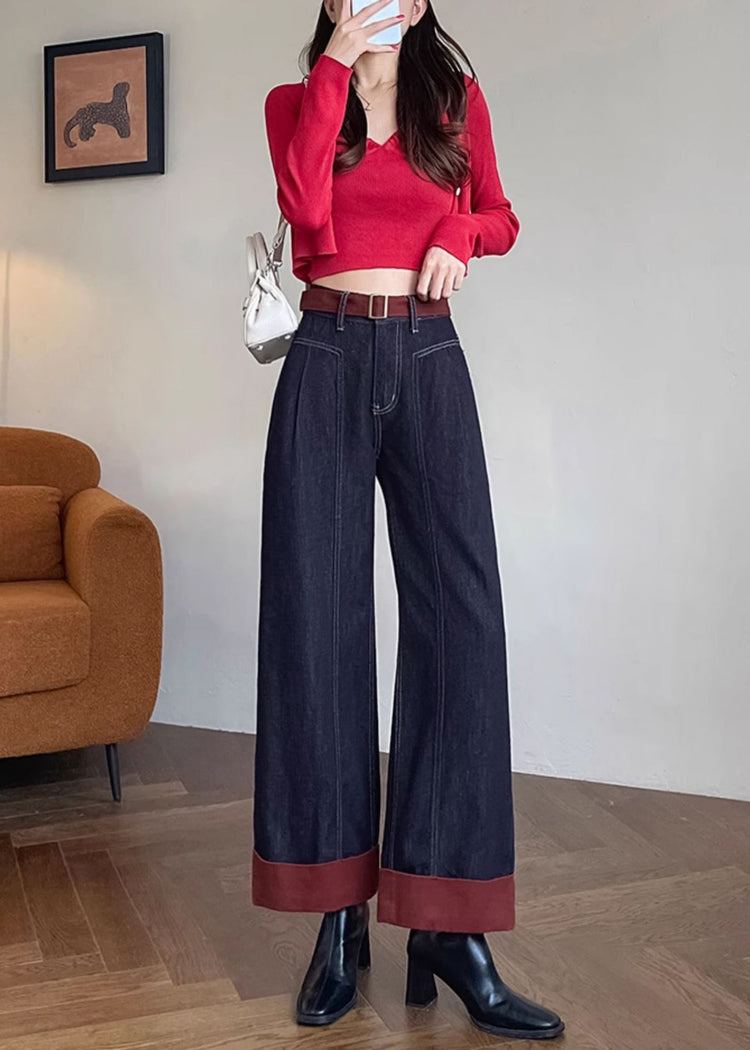 Simple Black Oversized Patchwork Denim Crop Pants Fall