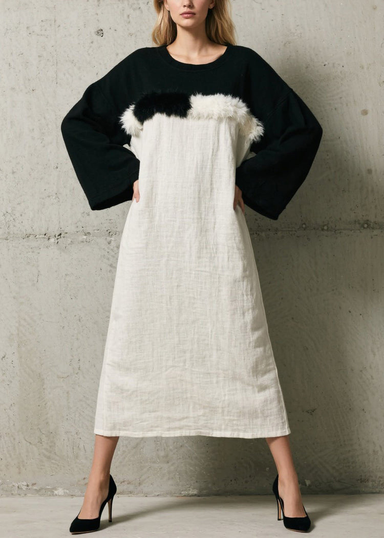 Simple Black White Patchwork Faux Fur Maxi Dress Fall