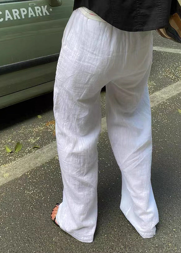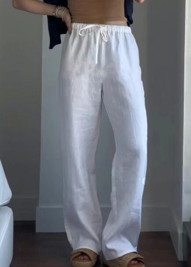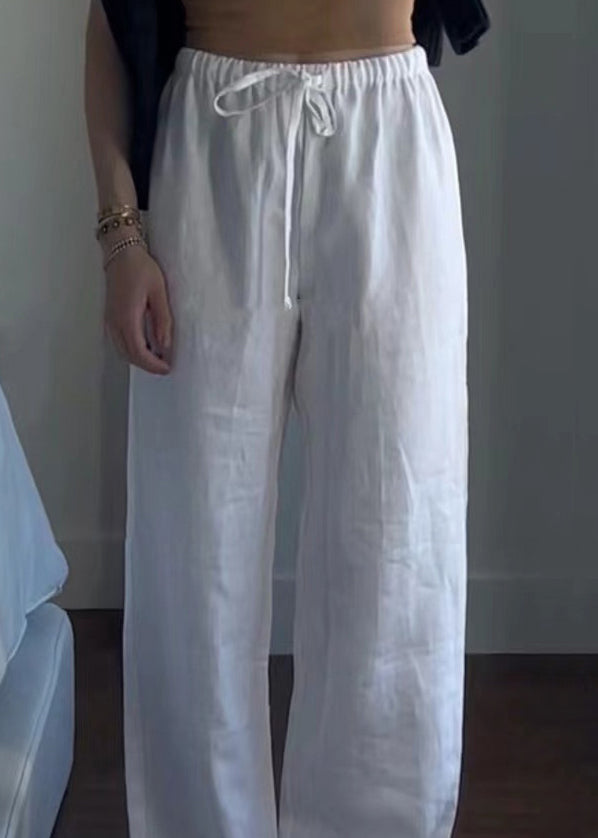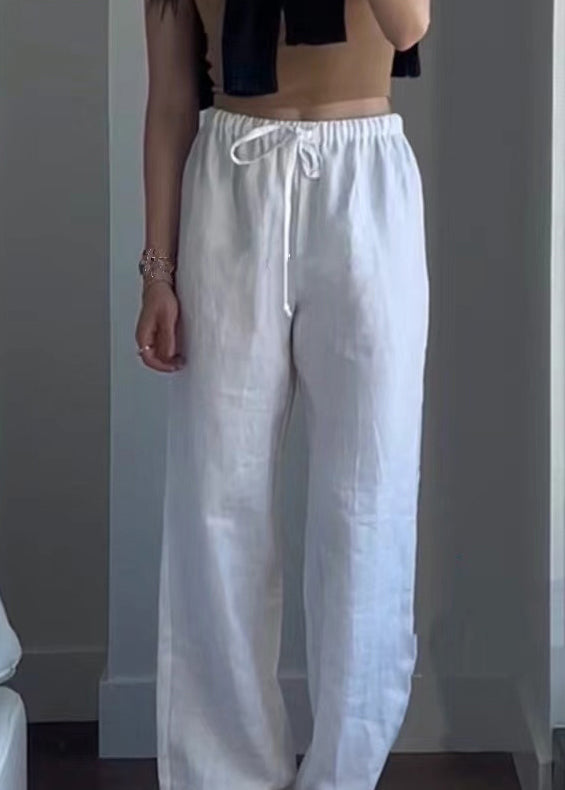 Simple White Elastic Waist Lace Up Linen Pants Summer