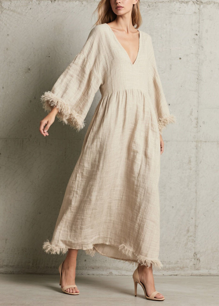 Simple White V Neck Patchwork Faux Fur Ankle Dress Fall