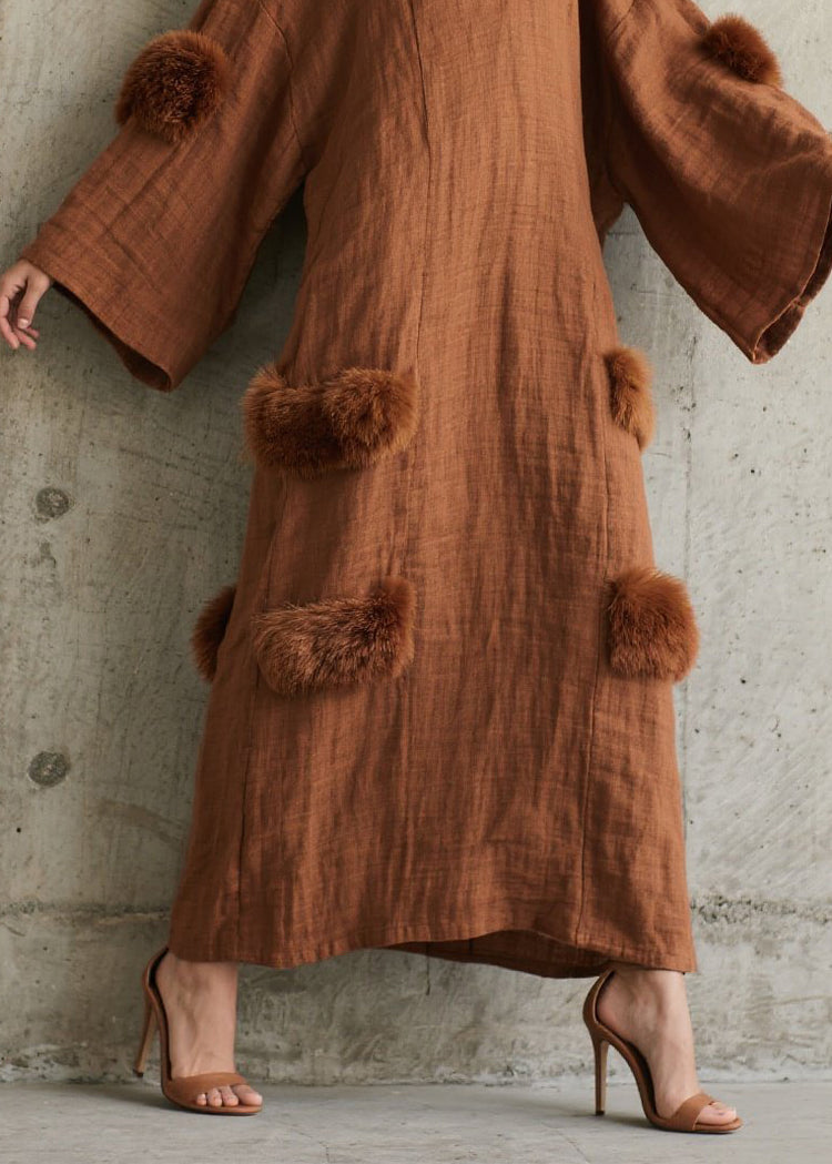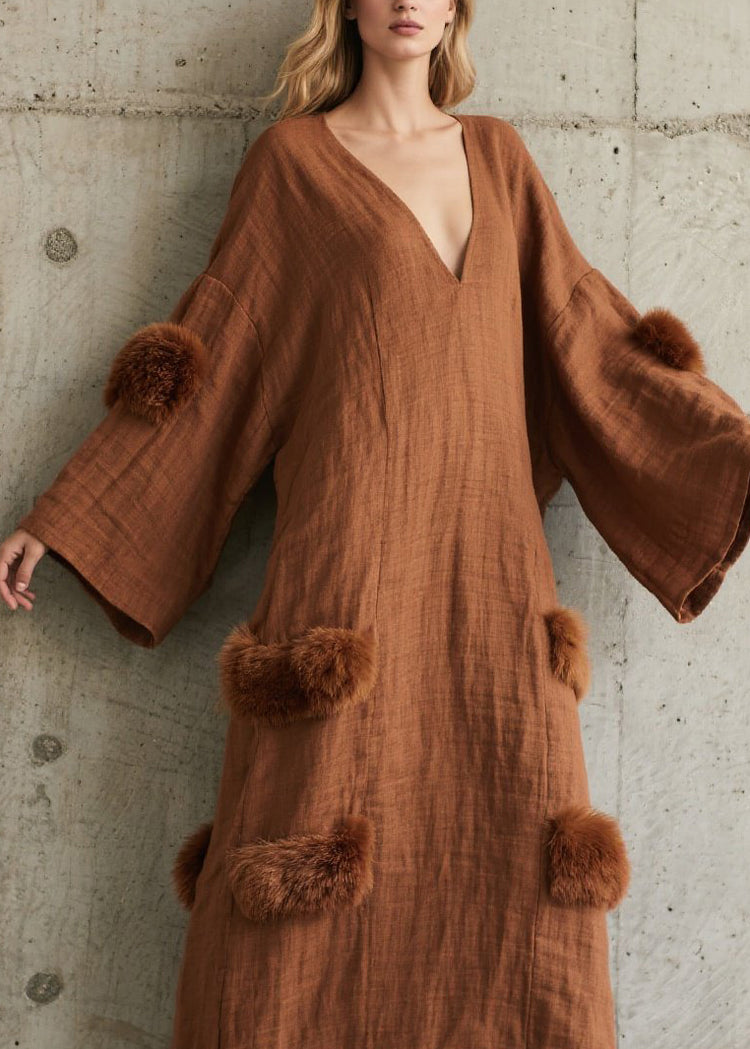 Style Brown V Neck Fuzzy Fur Patchwork Cotton Dress Fall