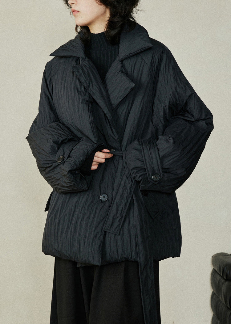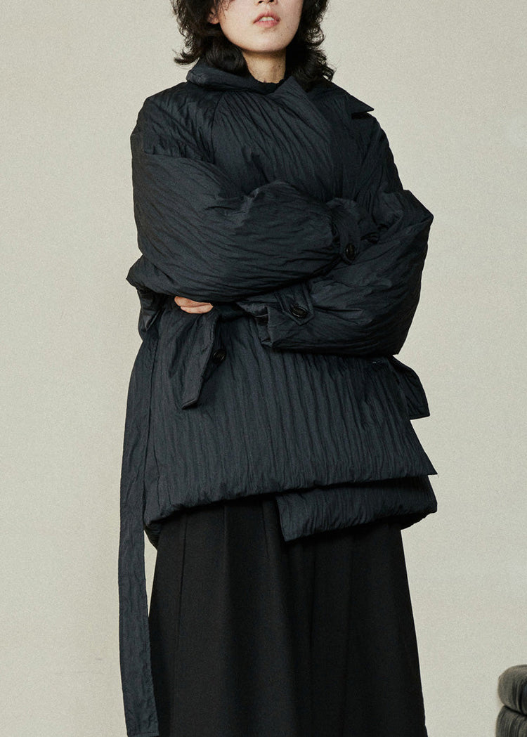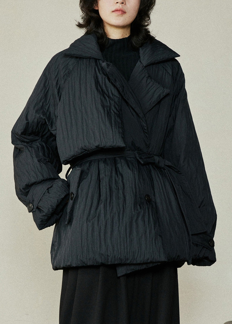 Stylish Black Peter Pan Collar Pockets Tie Waist Parka Winter