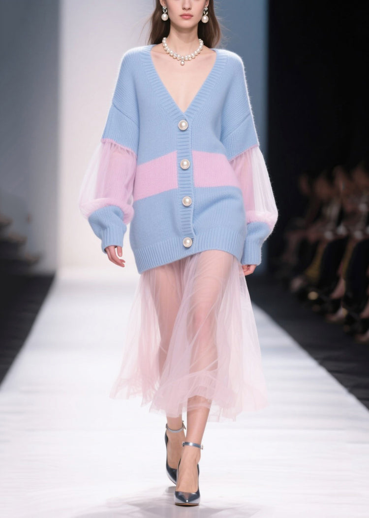 Stylish Blue Patchwork Tulle Fine Pearl Knit Cardigan Fall