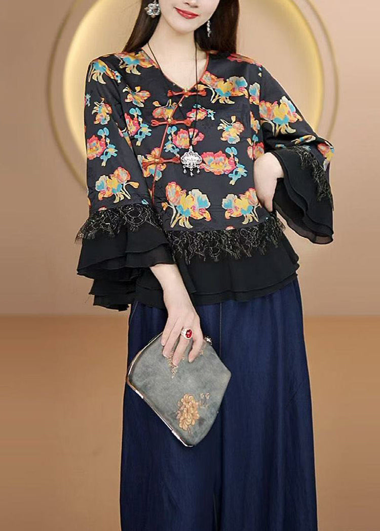 Unique Black Oriental Button Patchwork Silk Blouses Fall
