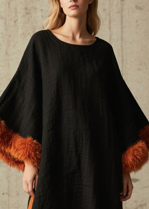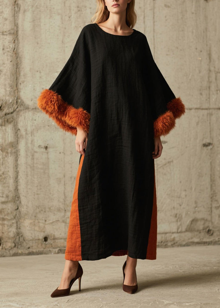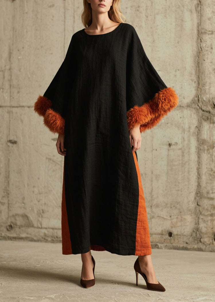 Unique Black Oversized Patchwork Faux Fur Maxi Dresses Flare Sleeve
