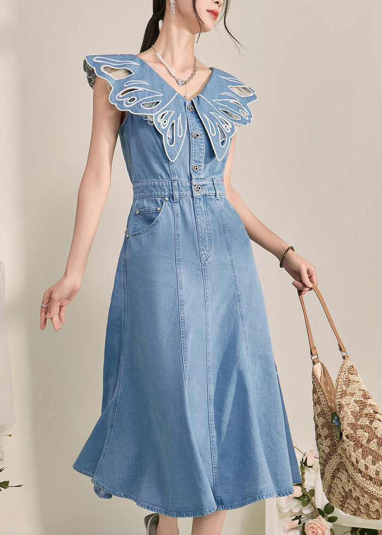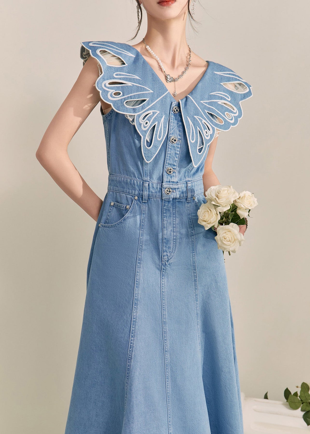 Unique Blue Patchwork Hollow Out Denim Maxi Dress Short Sleeve