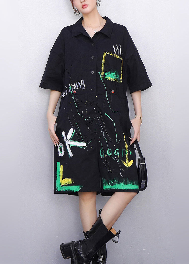 Whimsical Black Pockets Drawstring Cotton Jumpsuit Summer