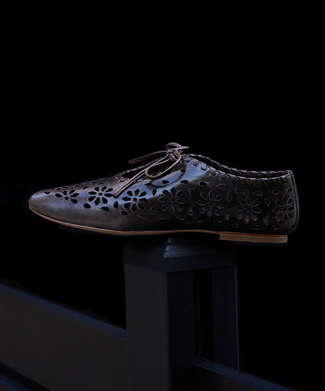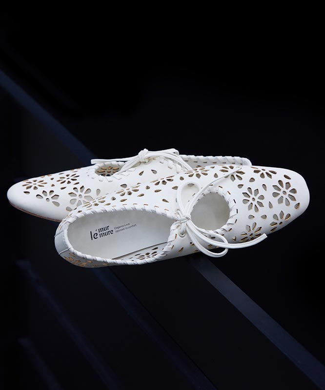 White Cowhide Leather Splicing Hollow Out Lace Up Flat Shoes