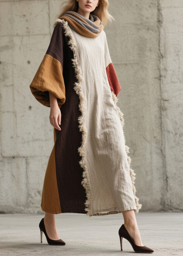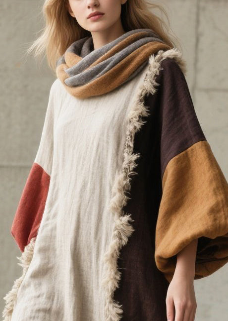White Patchwork Faux Fur Long Dresses Asymmetrical Lantern Sleeve