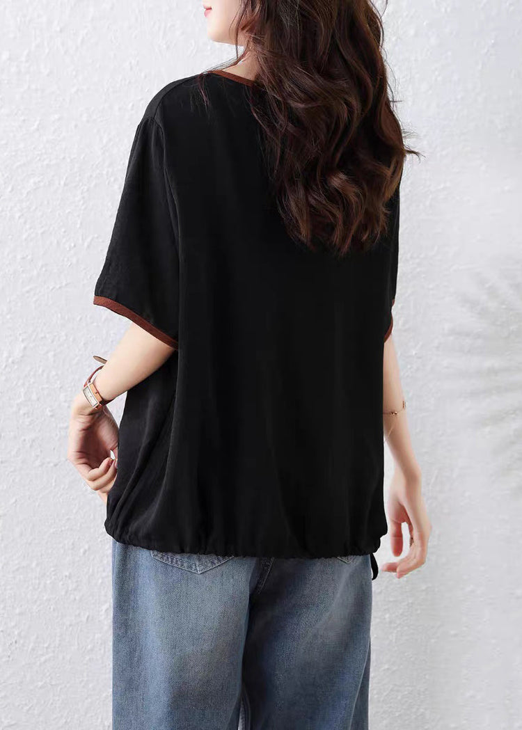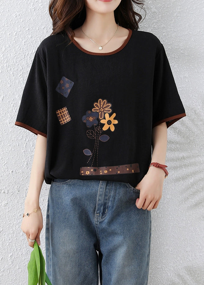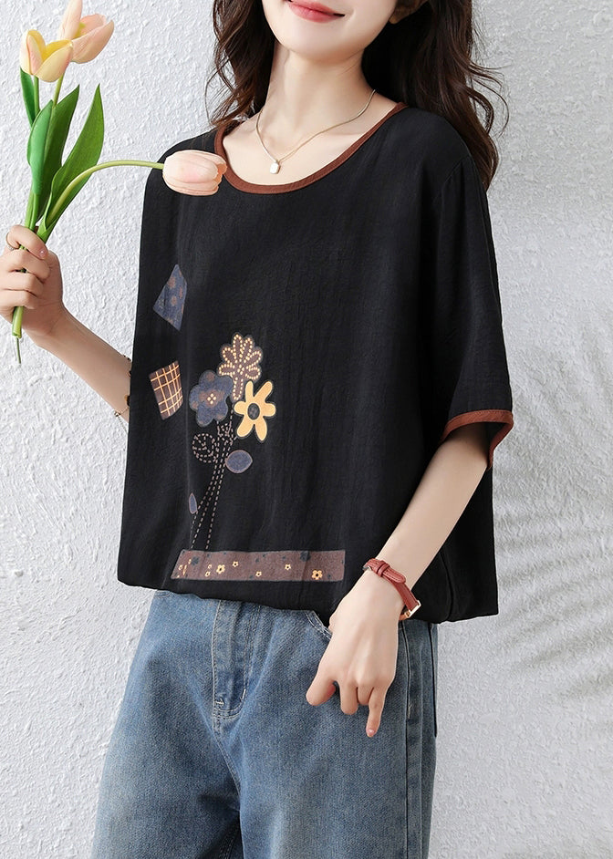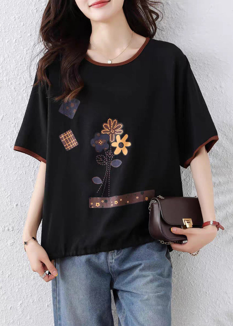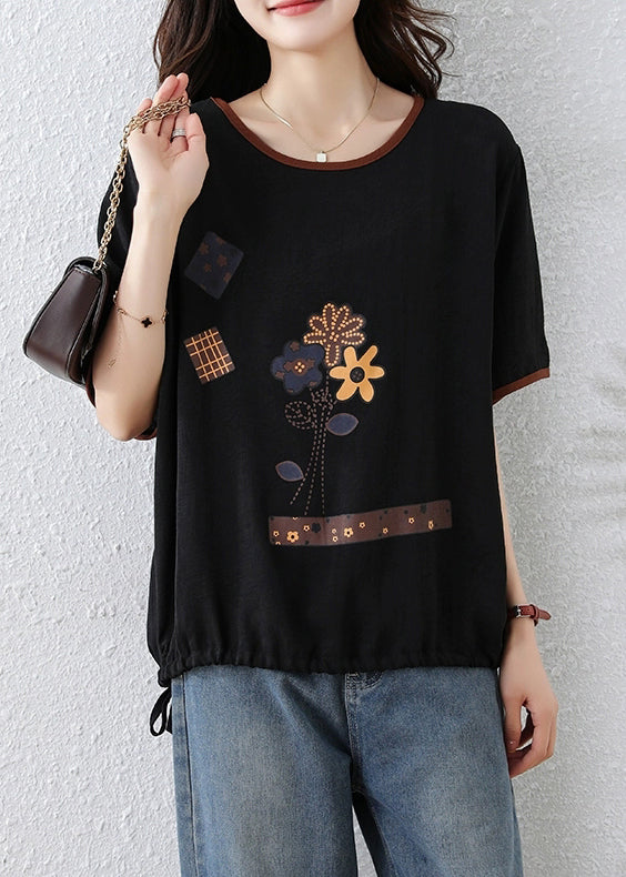 Women Black O Neck Print Lace Up Cotton T Shirt Summer