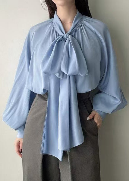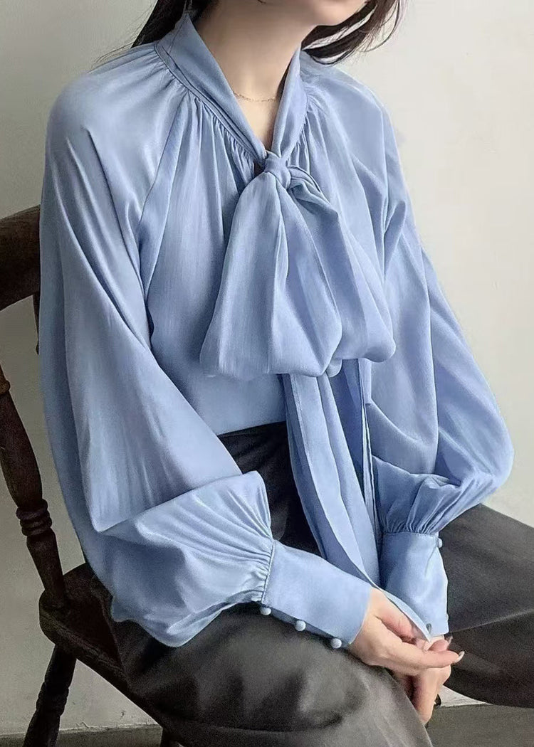 Women Blue Bow Oversized Silk Tops Lantern Sleeve