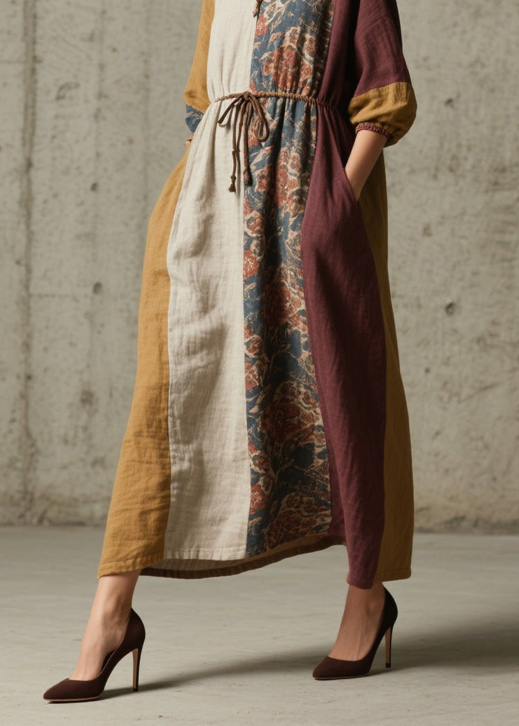 Women Colorblock V Neck Print Lace Up Cotton Dresses Fall