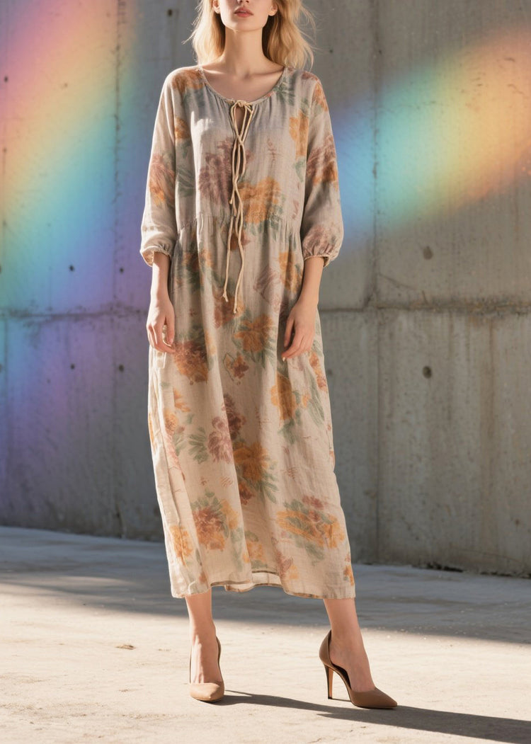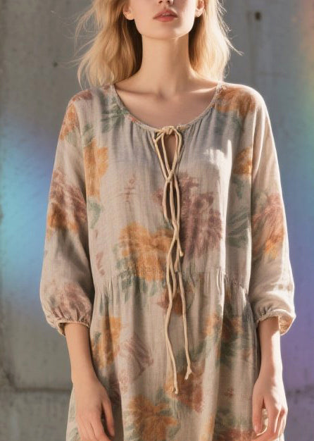 Women Khaki Print Cotton Party Dress Bracelet Sleeve
