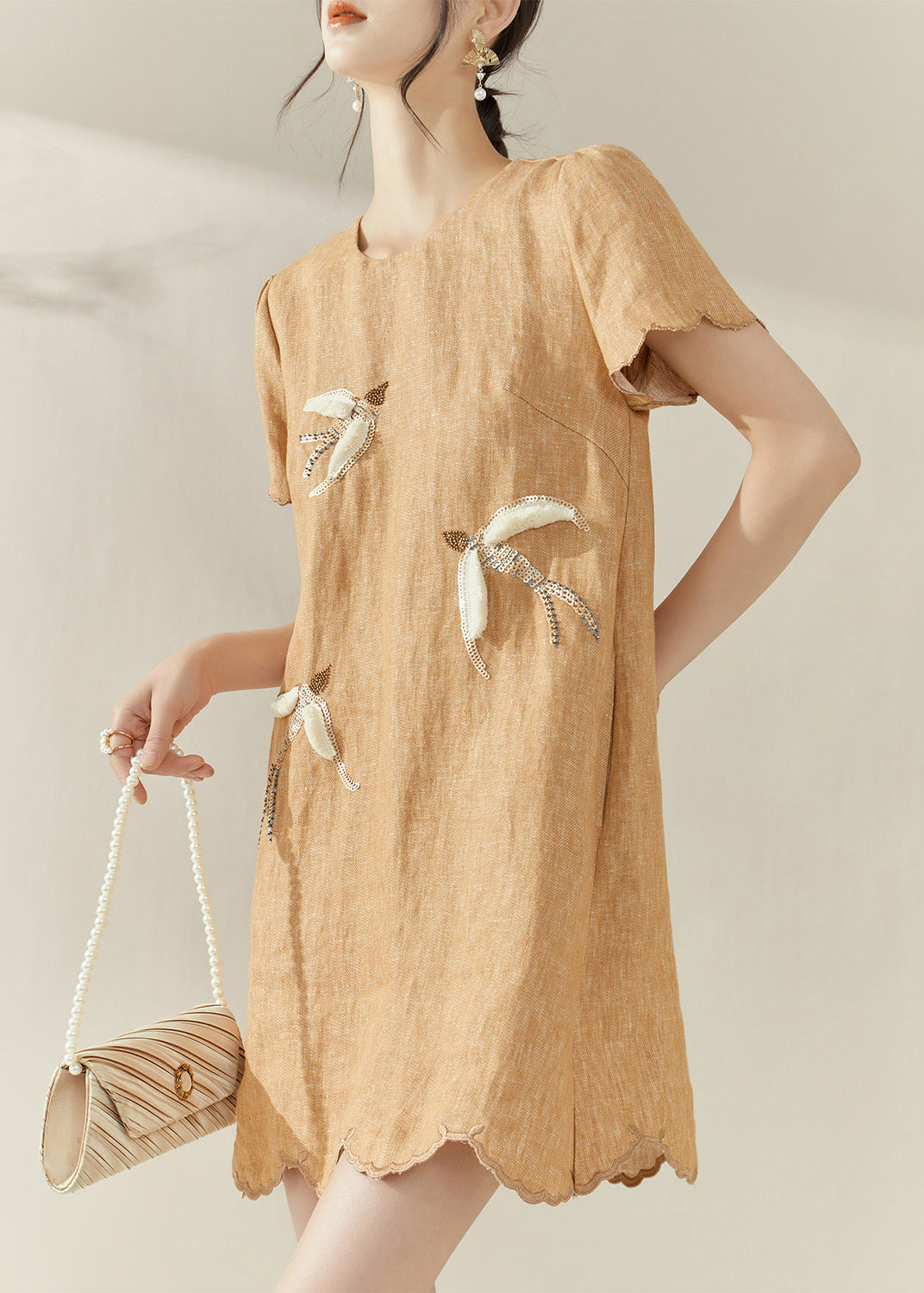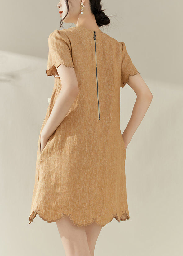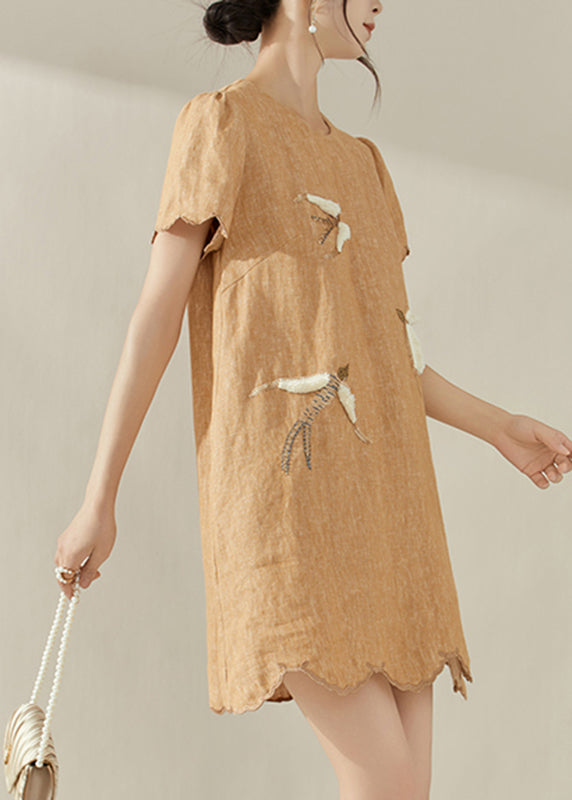 2025 New Orange O-Neck Embroidered Ruffled Mid Dress Summer