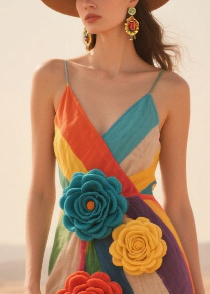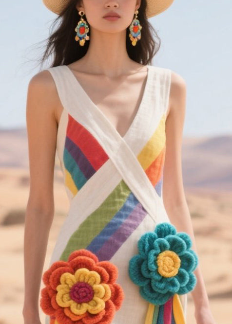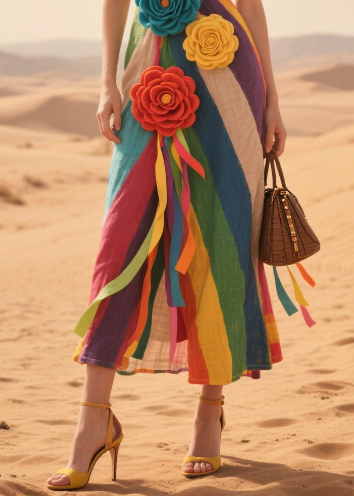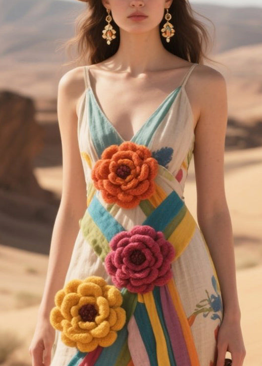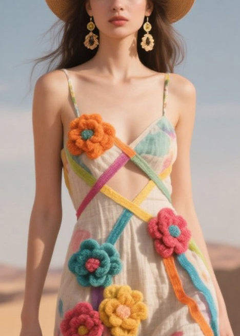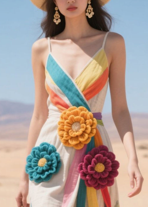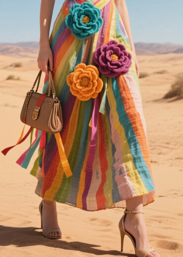 Chic Multicolor Striped Knitted Flower Cotton Cami Dresses Summer
