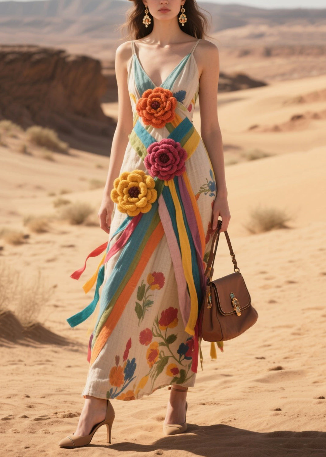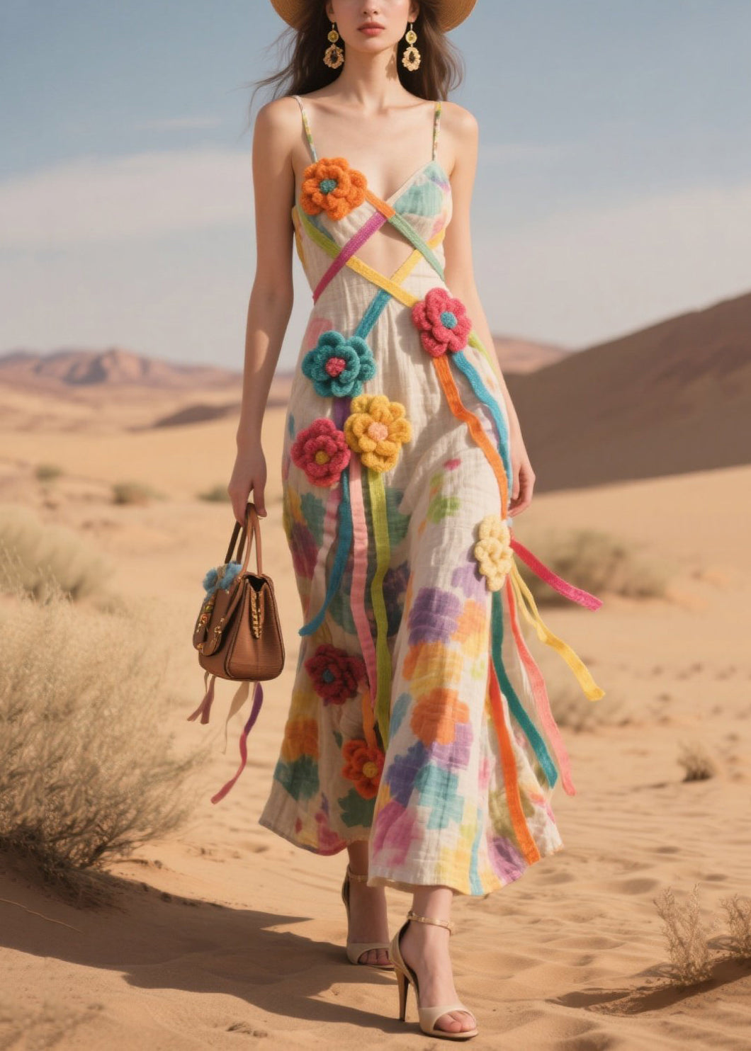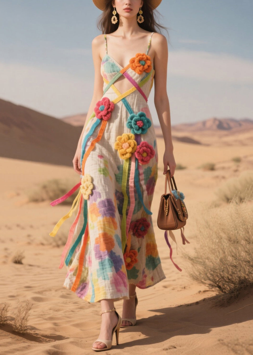 Art Khaki Floral Decorated Cotton Spaghetti Strap Dress Summer