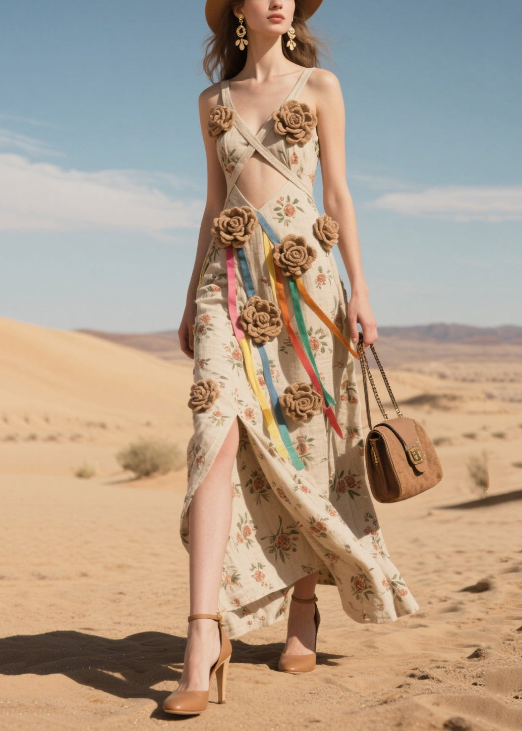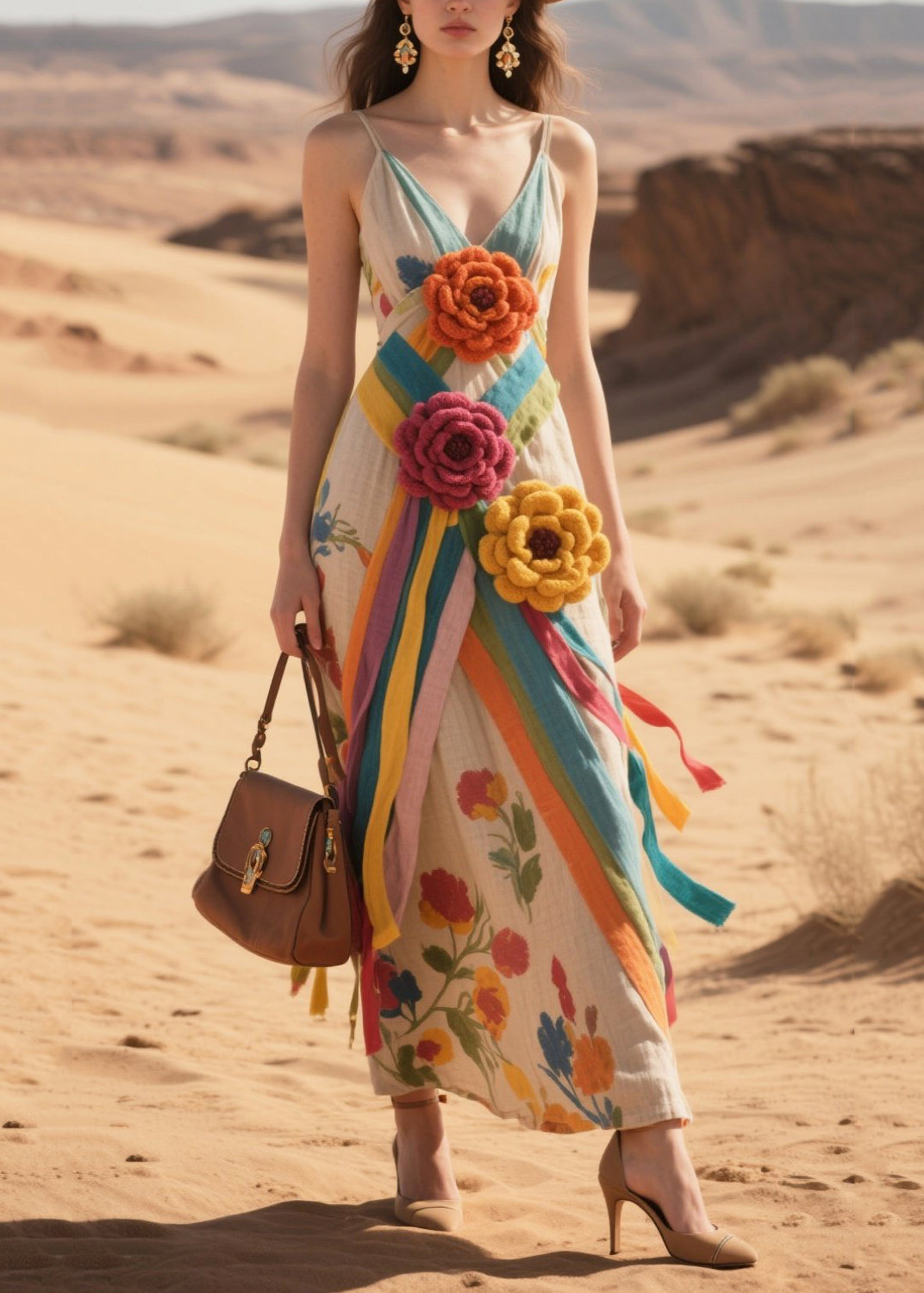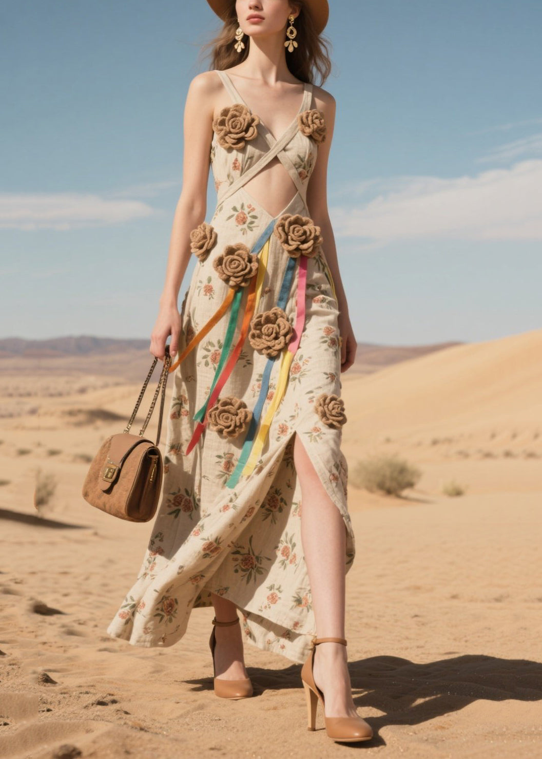 Art Khaki Floral Decorated Cotton Spaghetti Strap Dress Summer