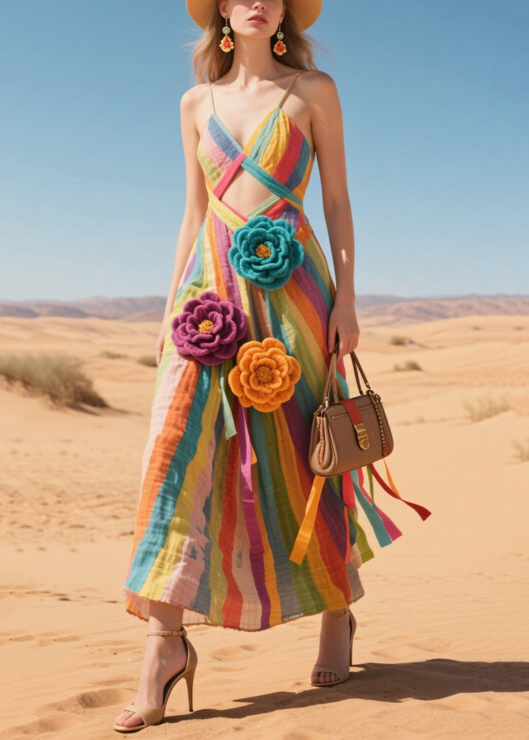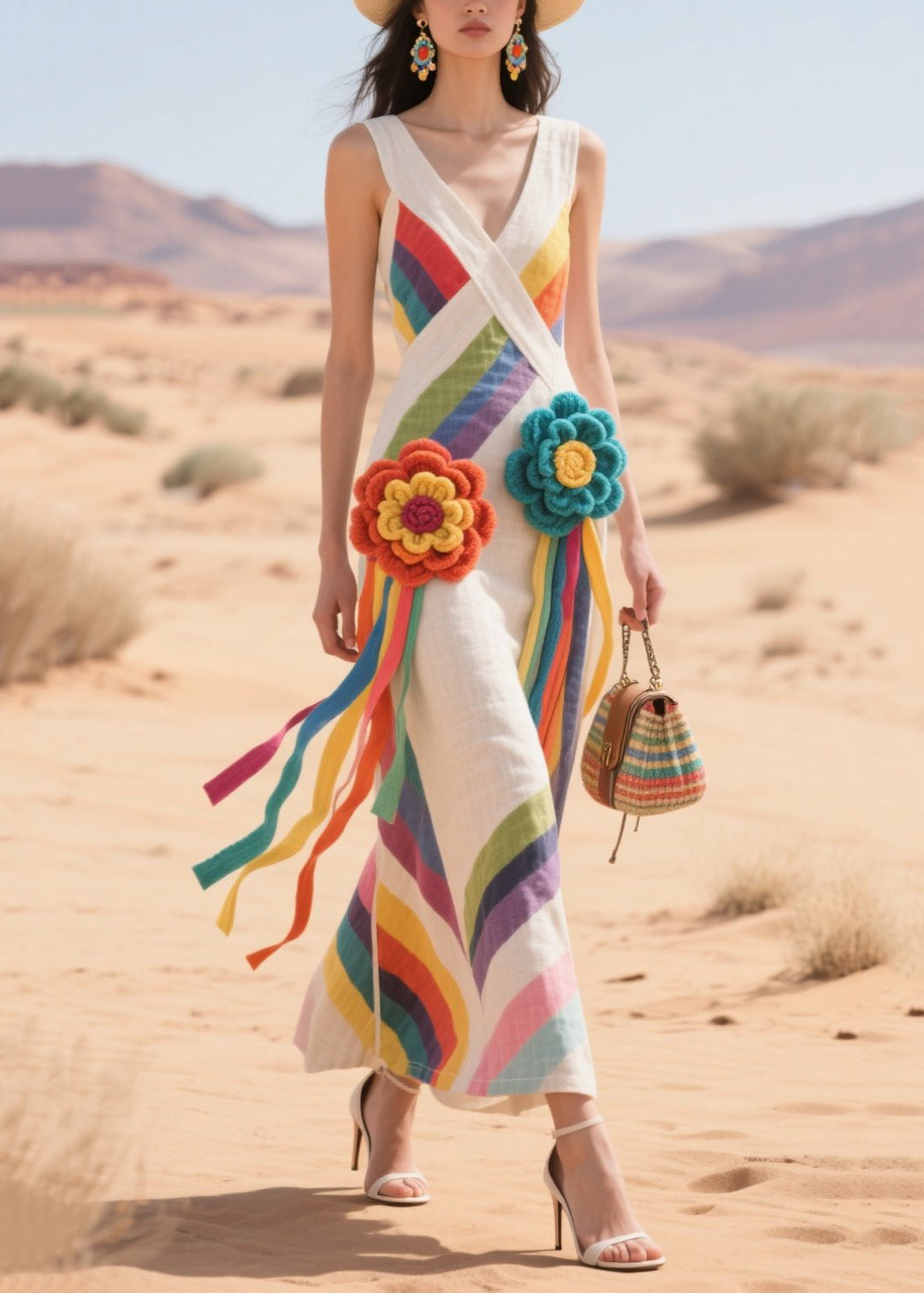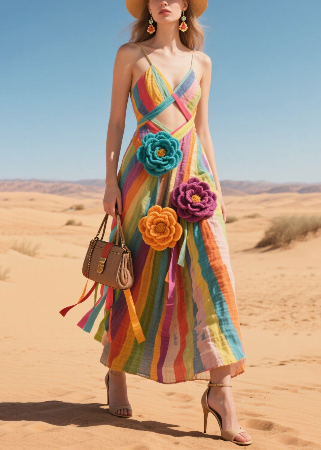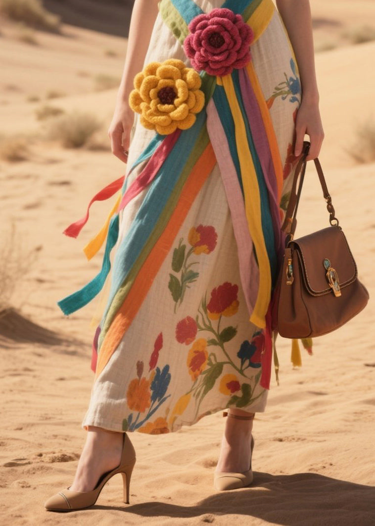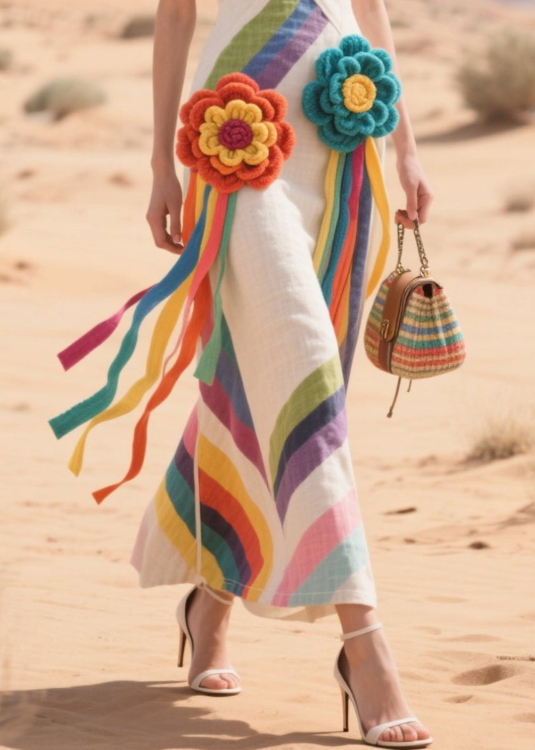 Rainbow Striped Cotton Sundress Knitted Flower Summer