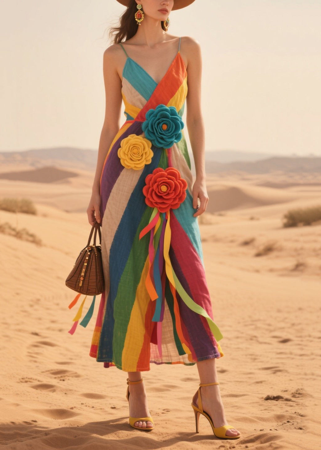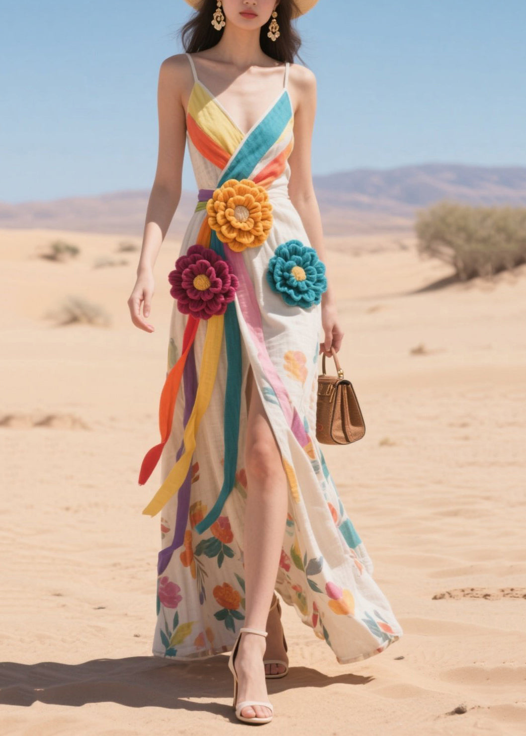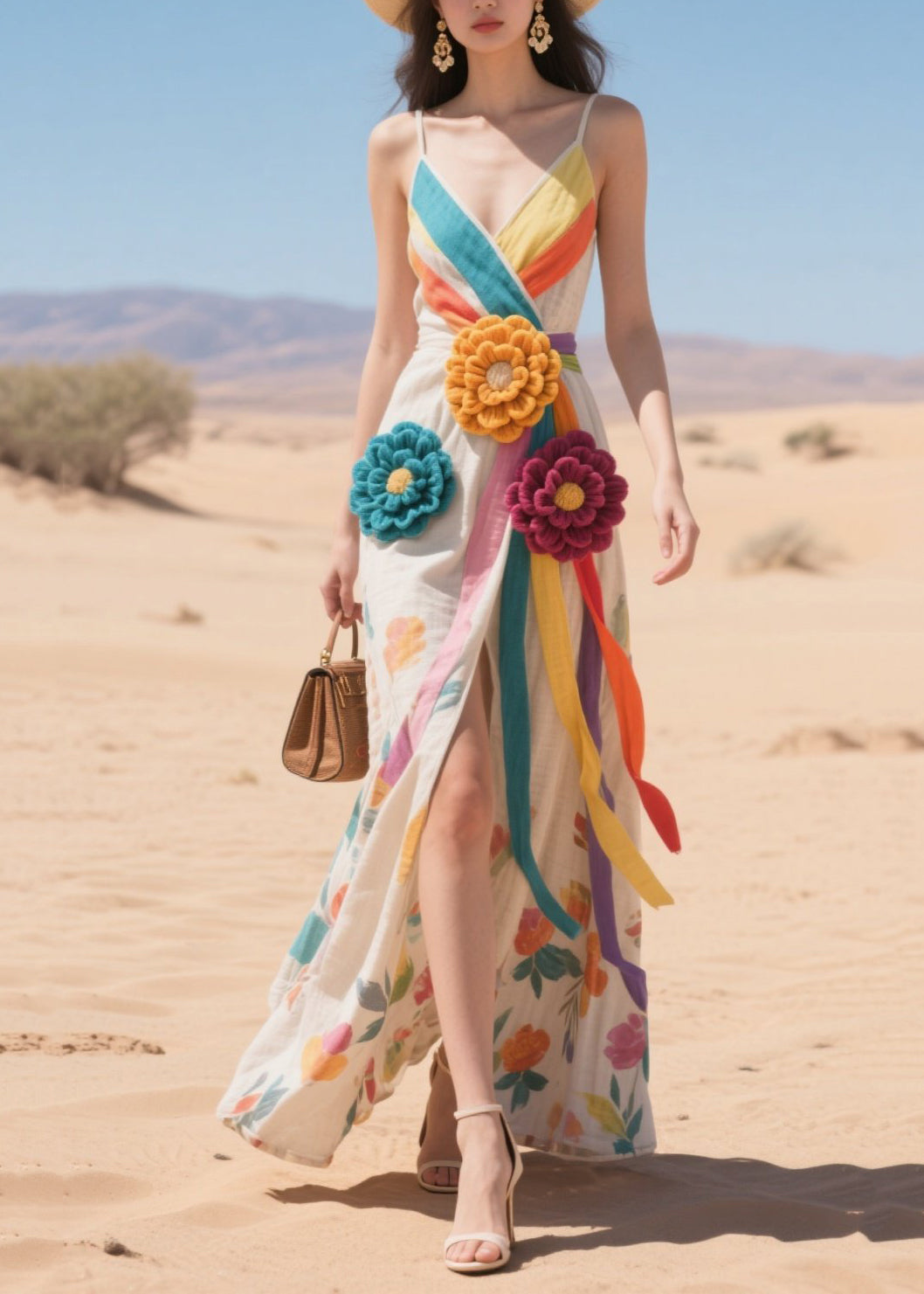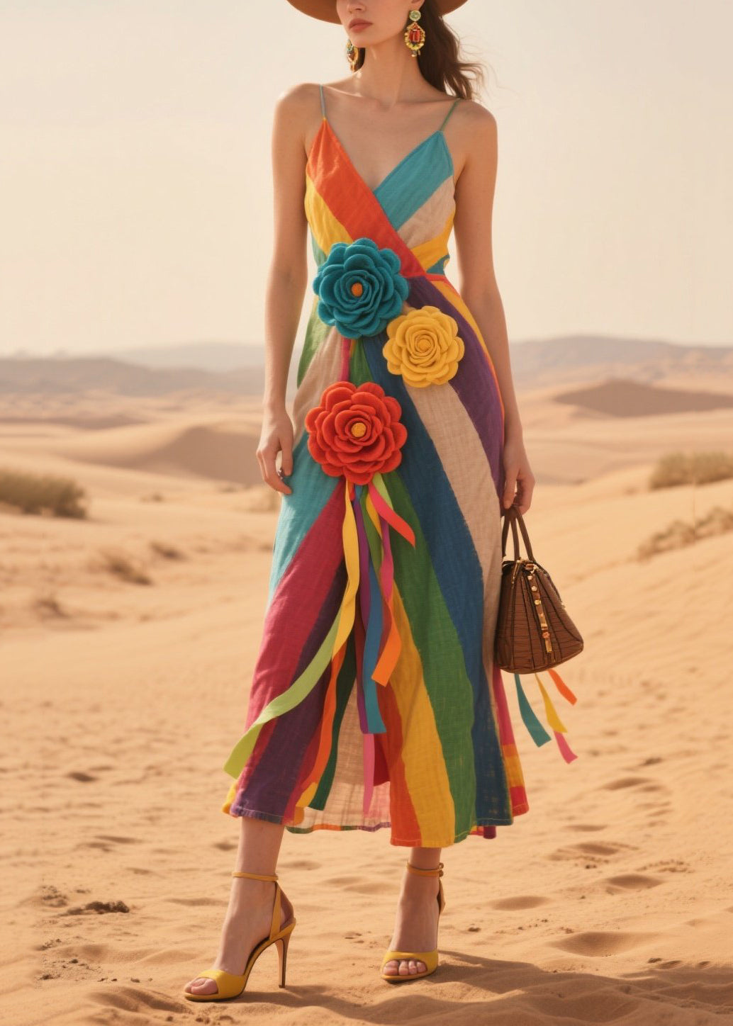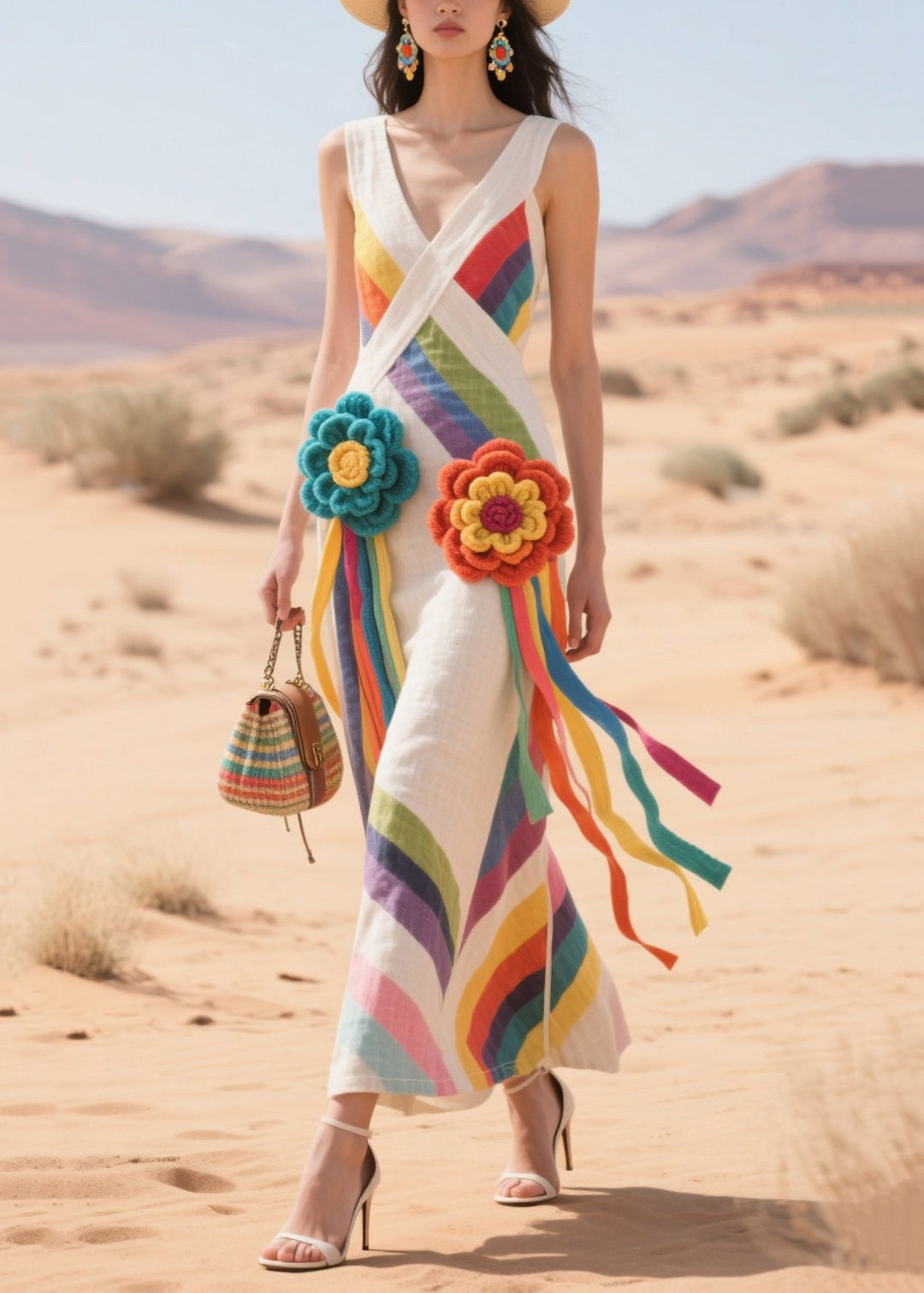 Rainbow Striped Cotton Sundress Knitted Flower Summer