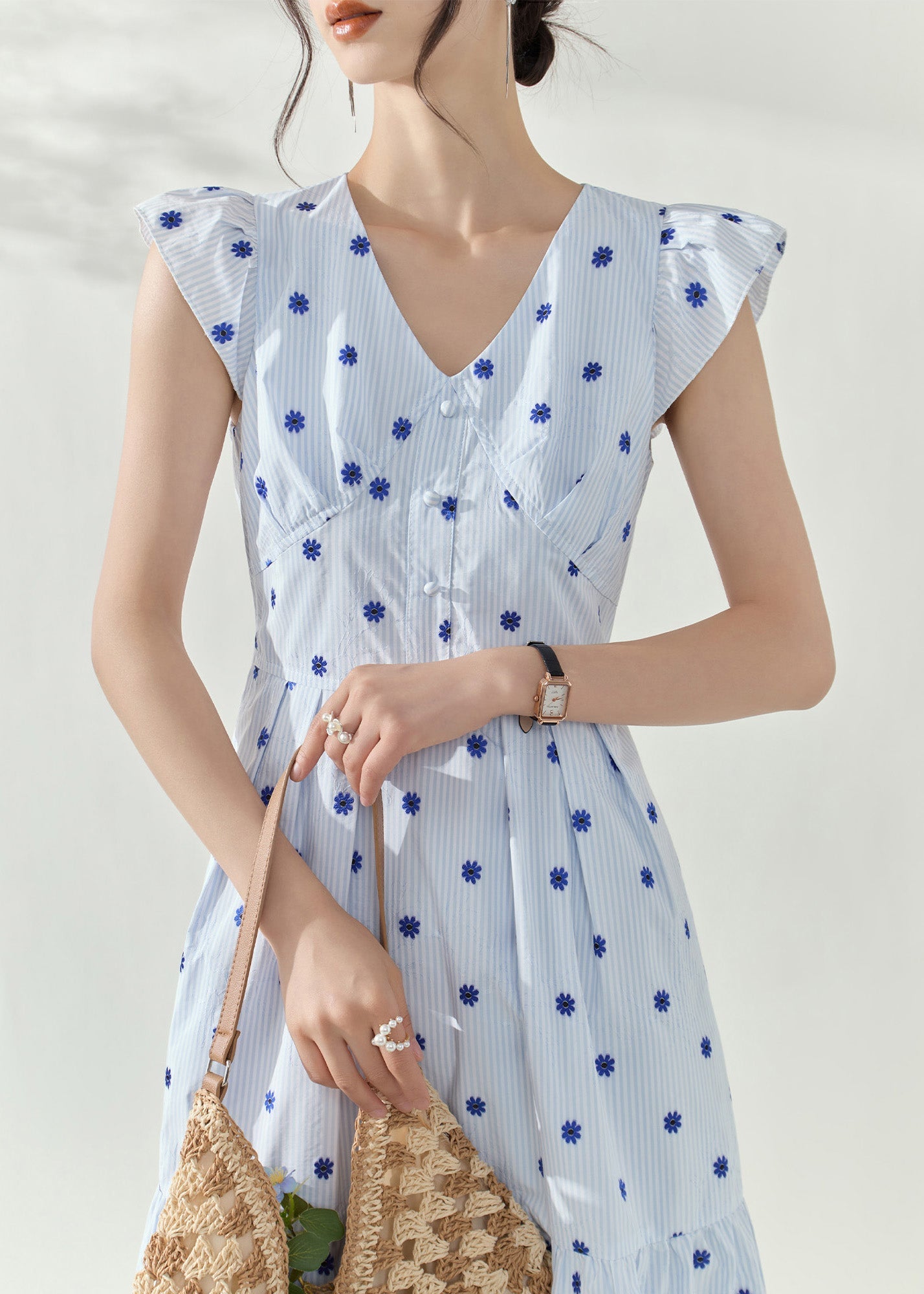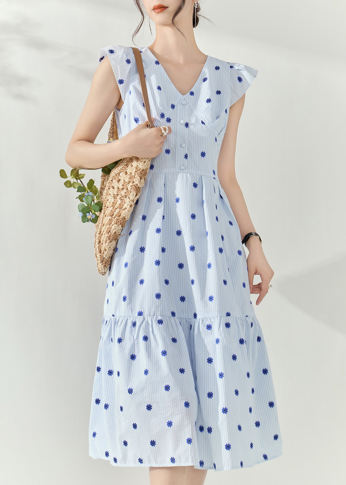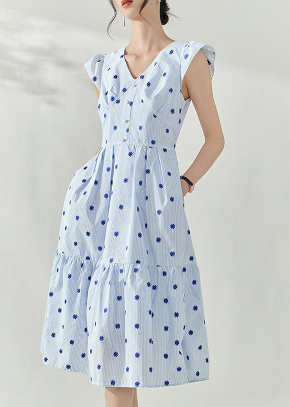 Fashion White Striped Flower Decorated Cotton Tea Dress Summer