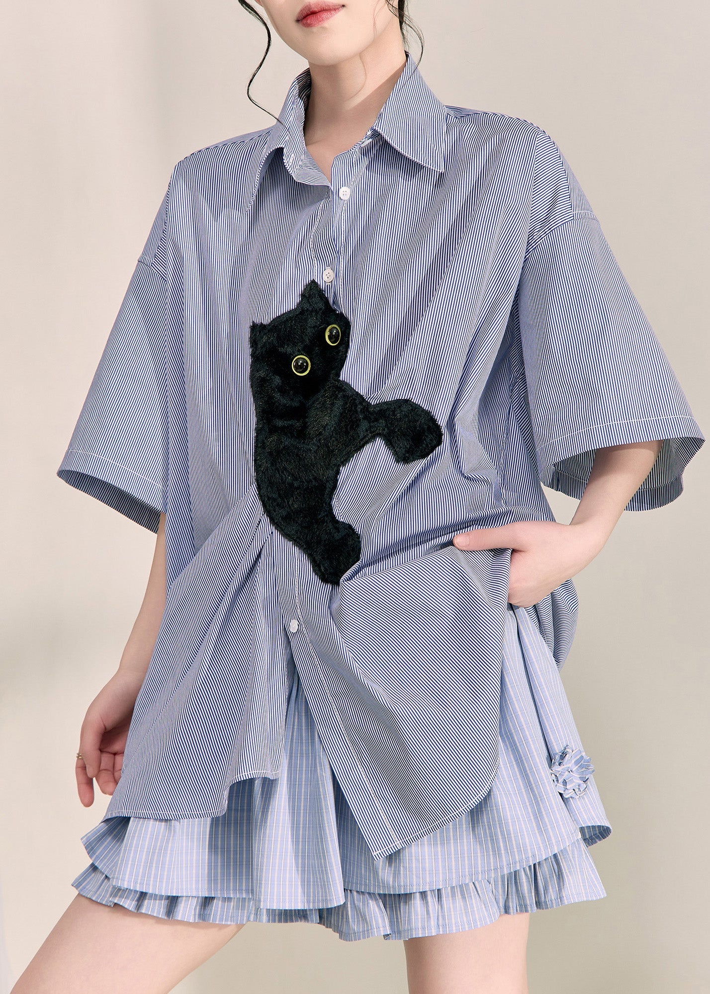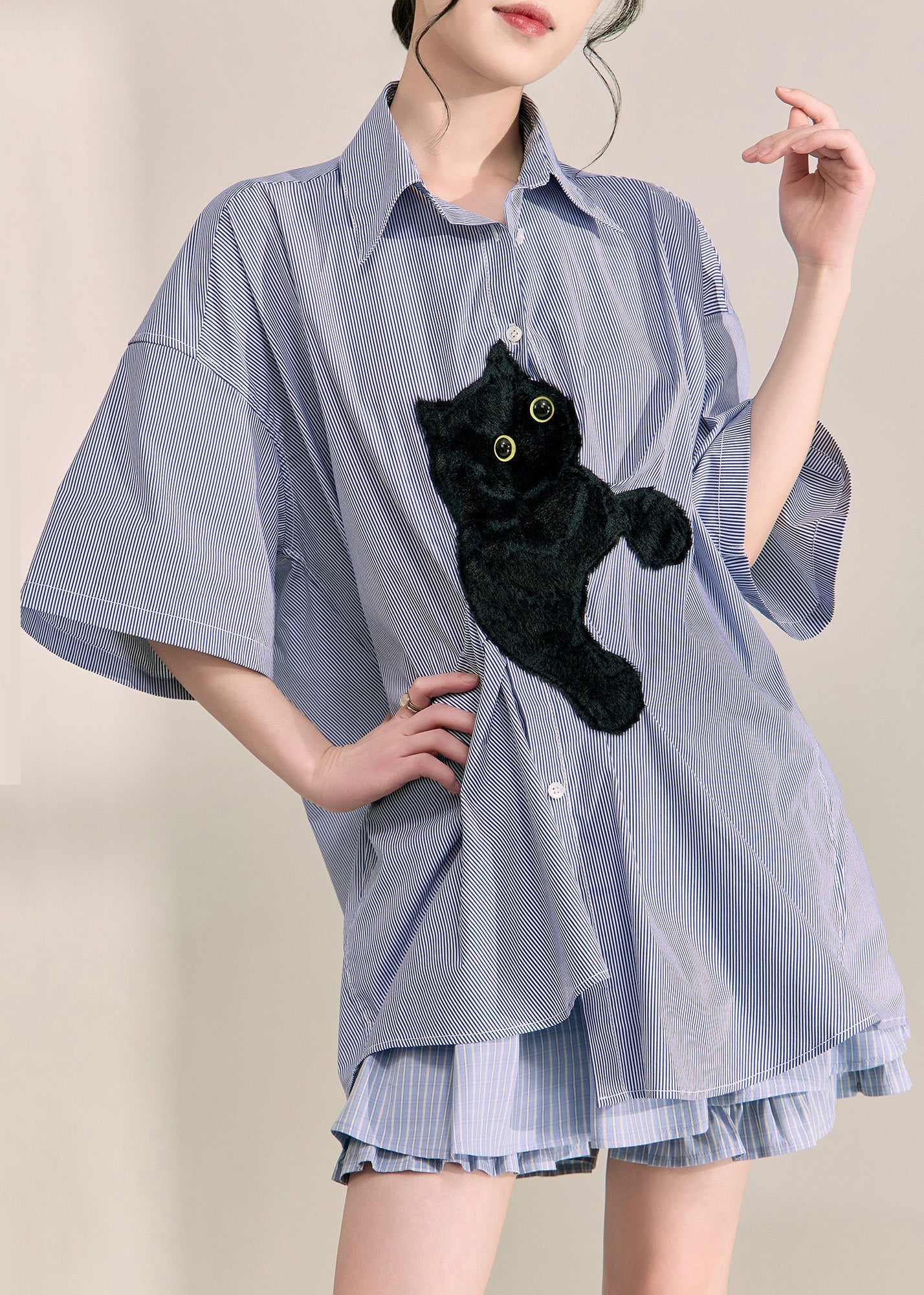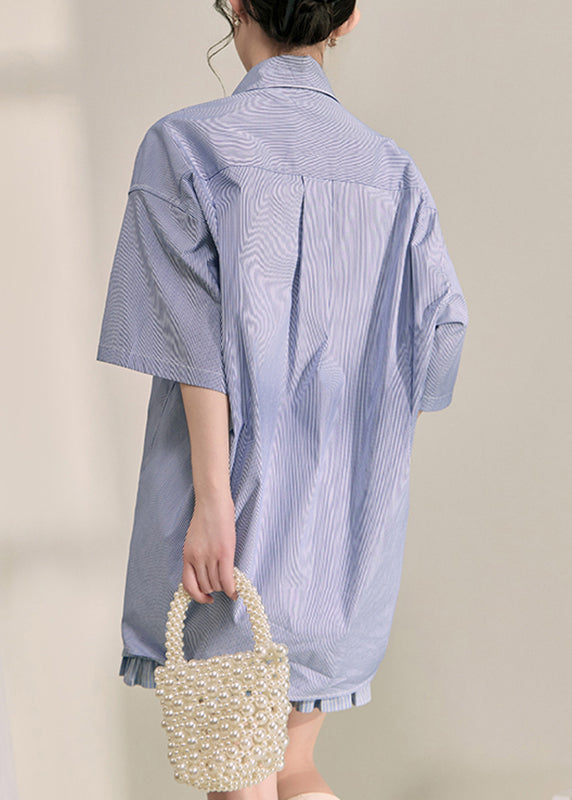 Casual Blue Peter Pan Collar Little Cats Striped Shirts Summer