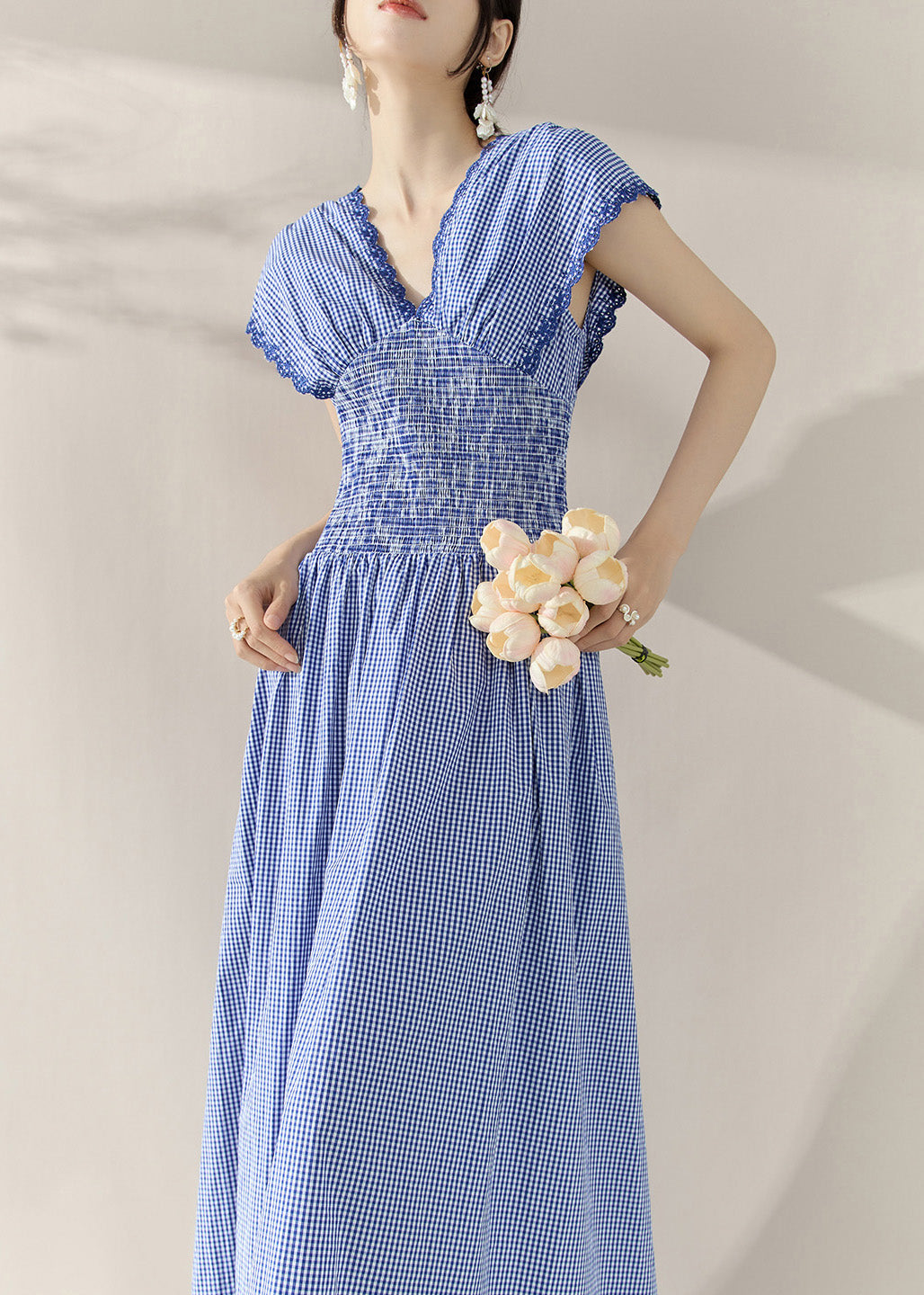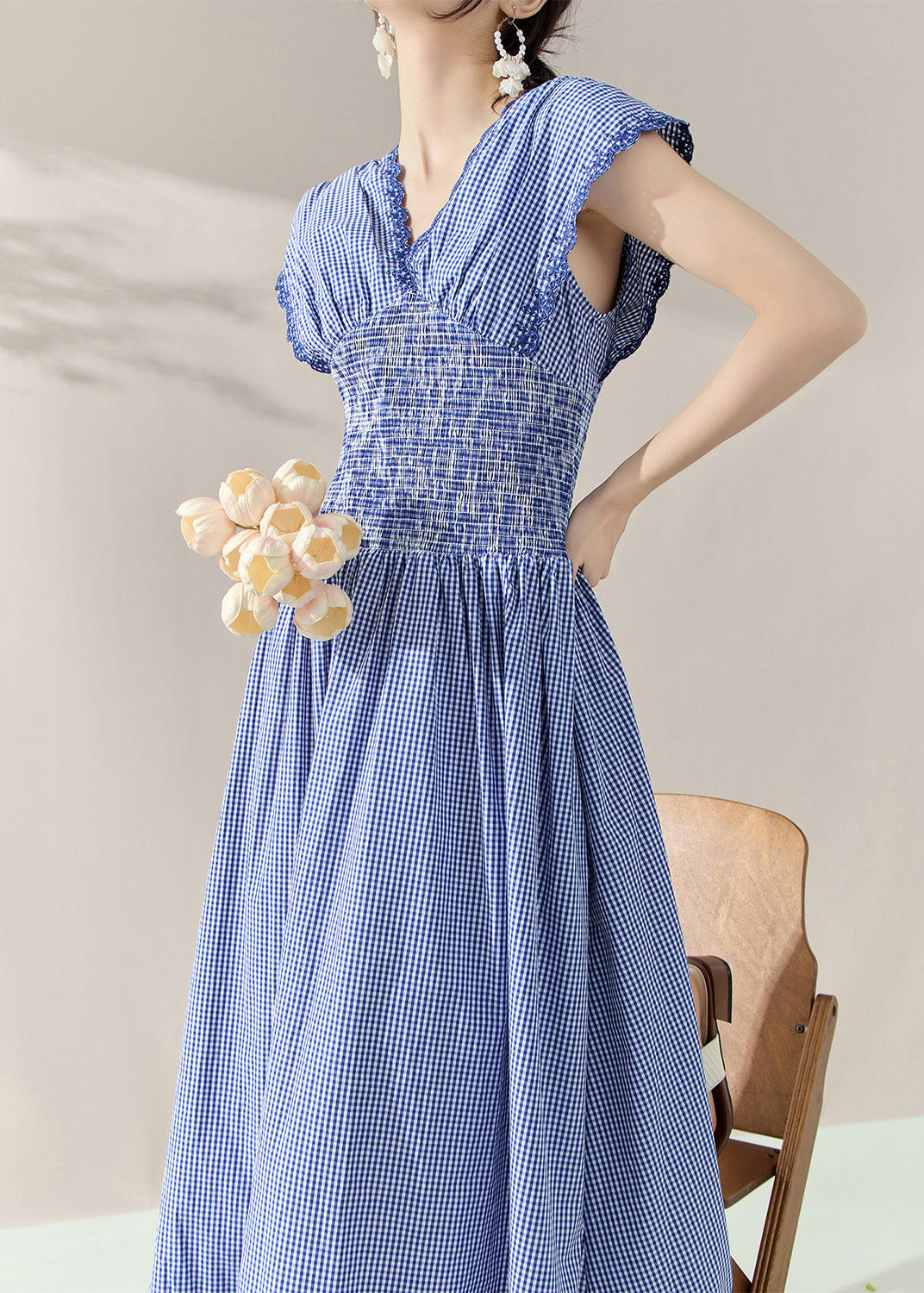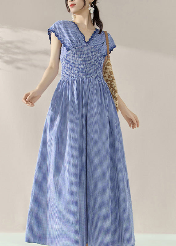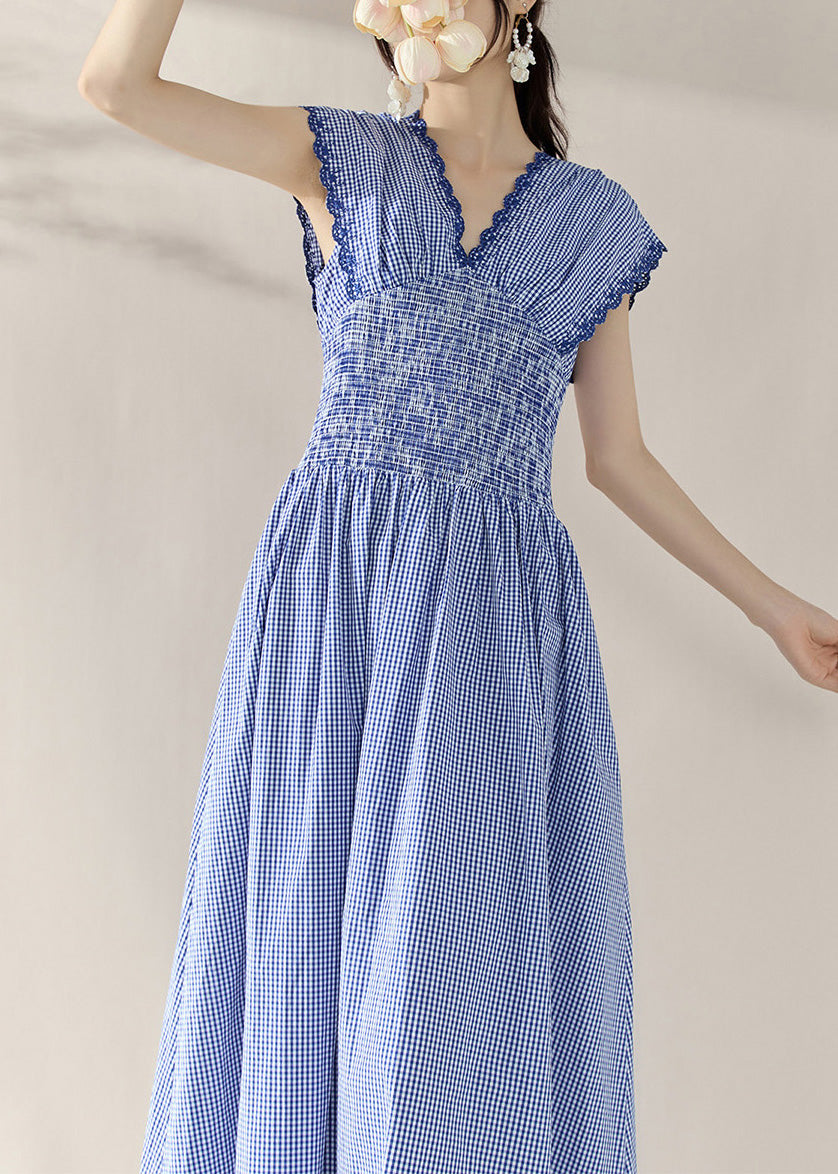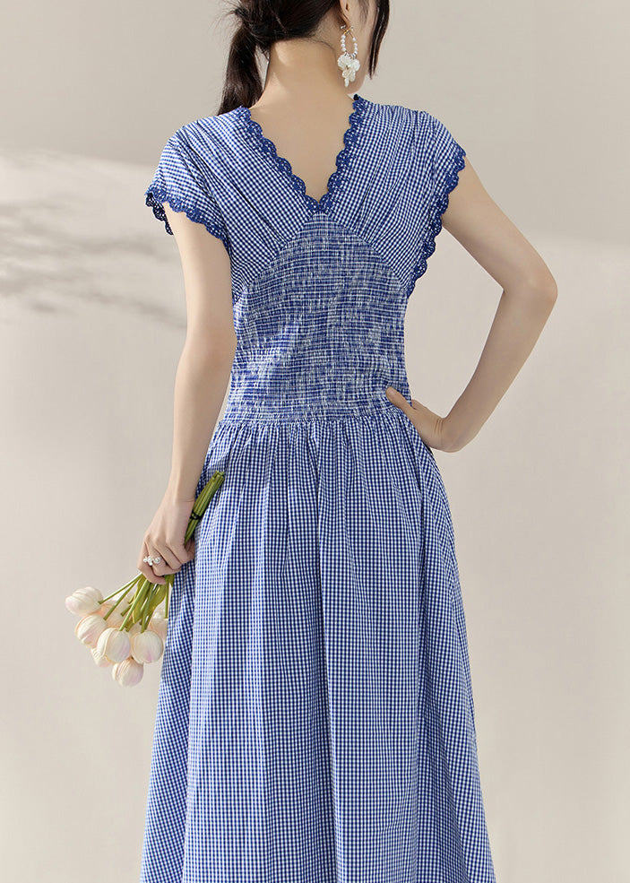 Fitted Blue V Neck Plaid Elastic Waist Holiday Long Dress Summer