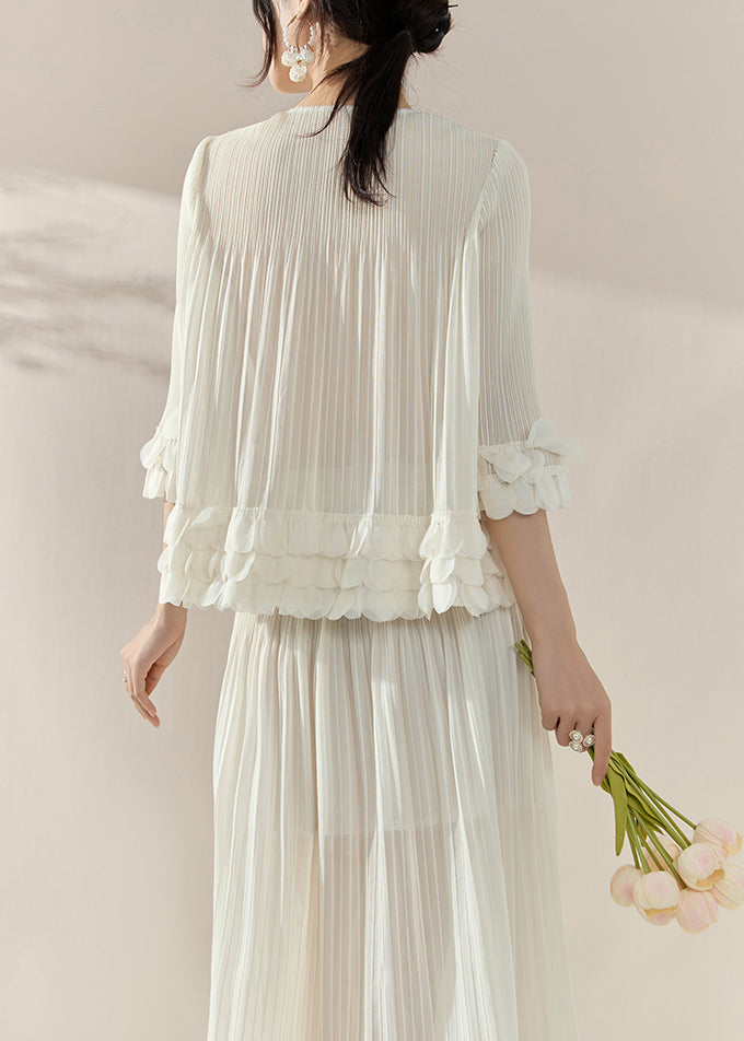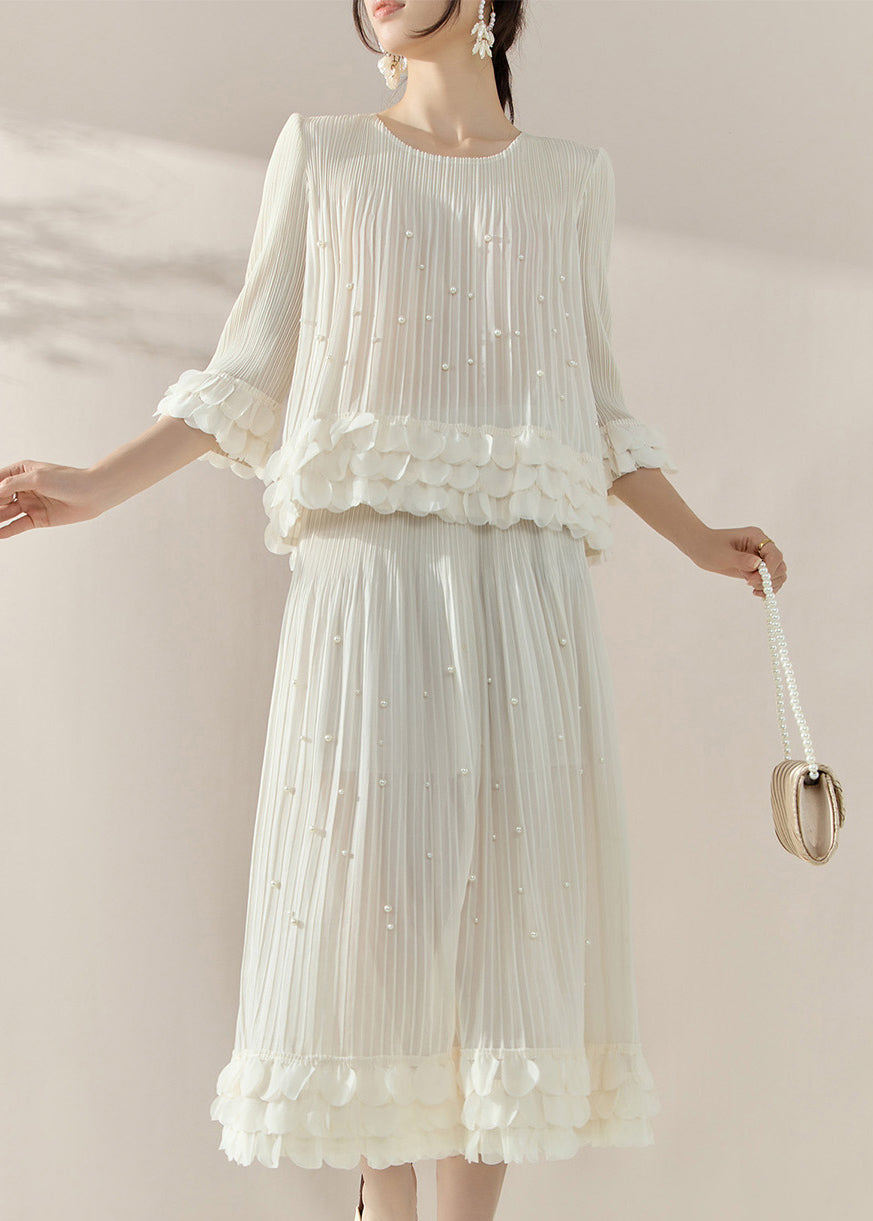 French White Nail Bead Silk Cotton Top And Maxi Skirts Two Piece Set Half Sleeve