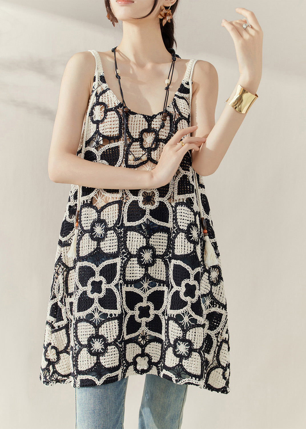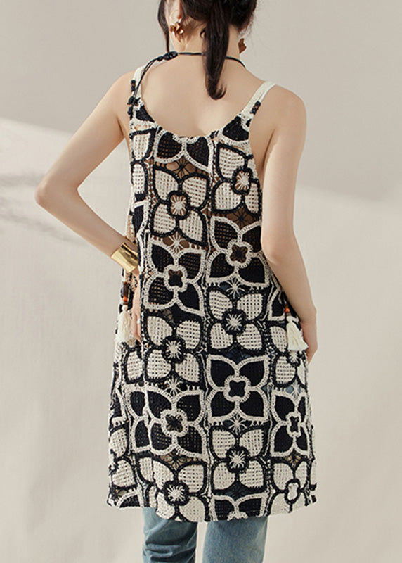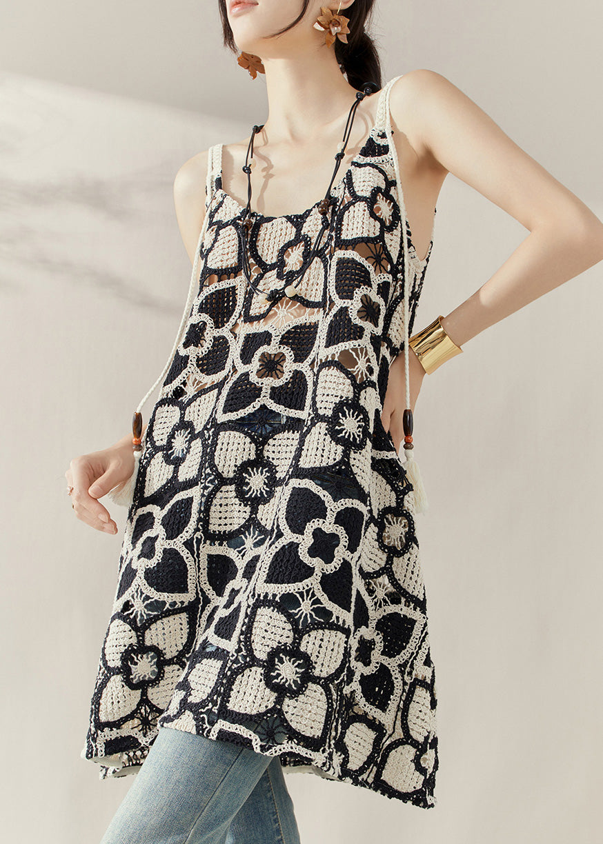 Classy Knitted Flower Hollow Out Side Open Cotton Cami Dress Summer