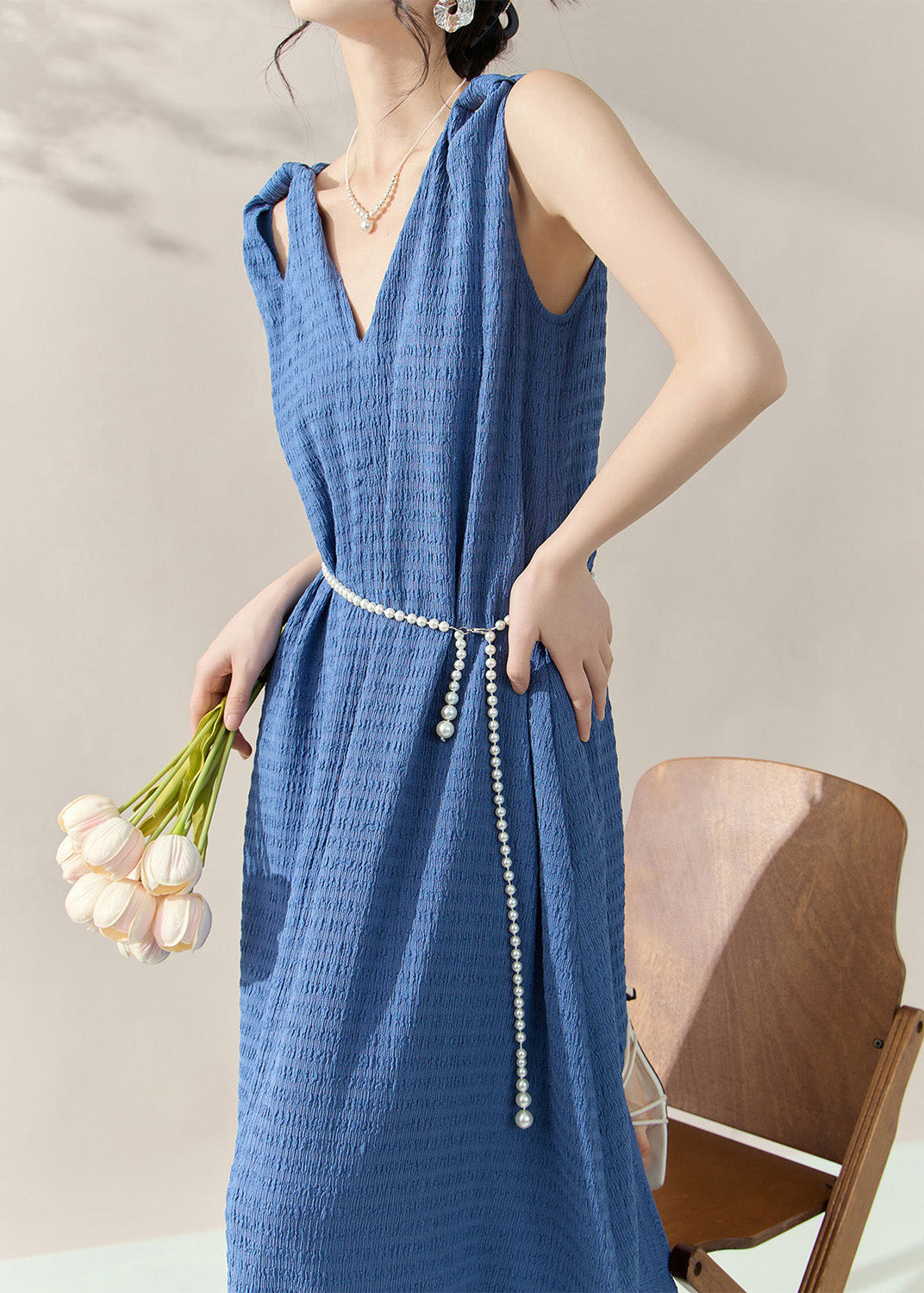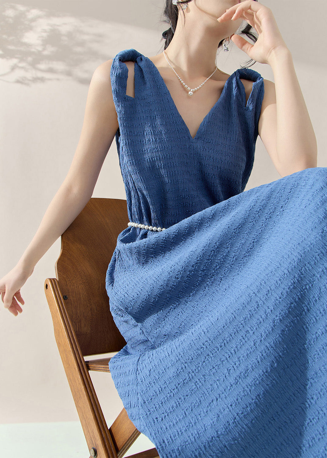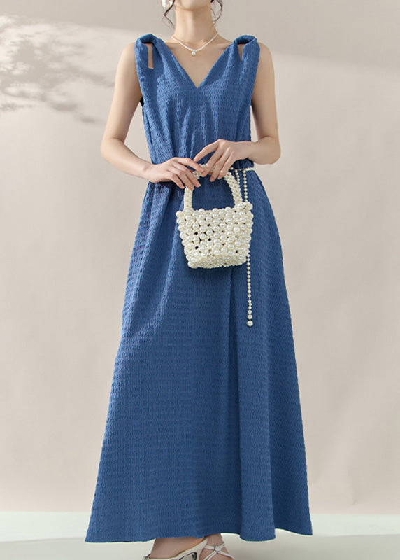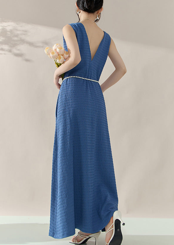 Brief Blue V Neck Long Dress Sleeveless