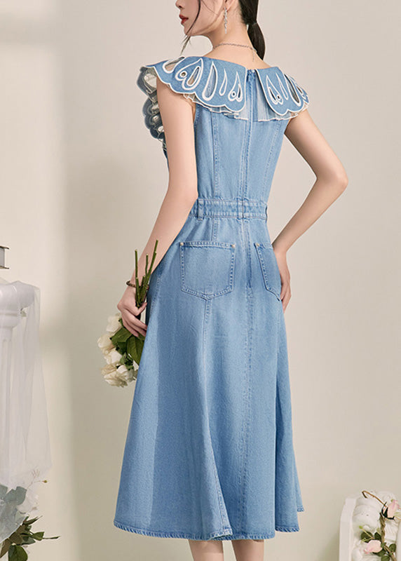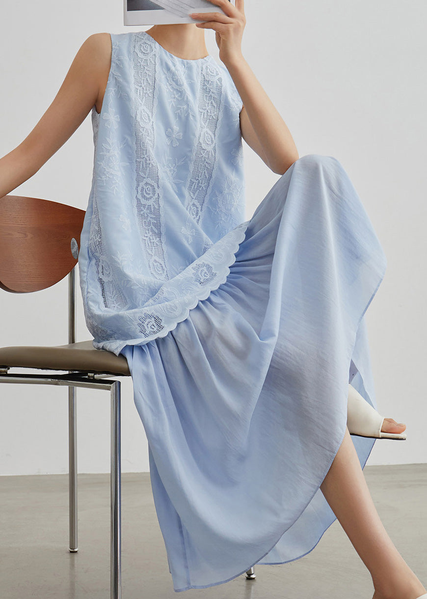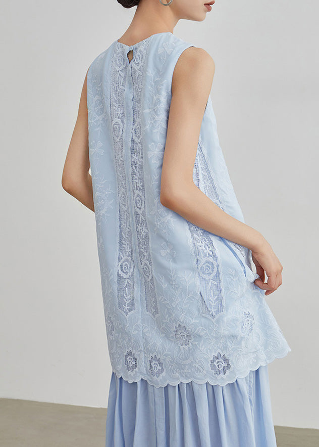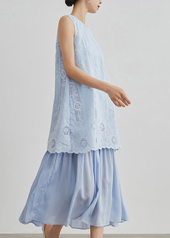 Casual Blue Embroidered Hollow Out Fake Two Pieces Long Dresses Sleeveless