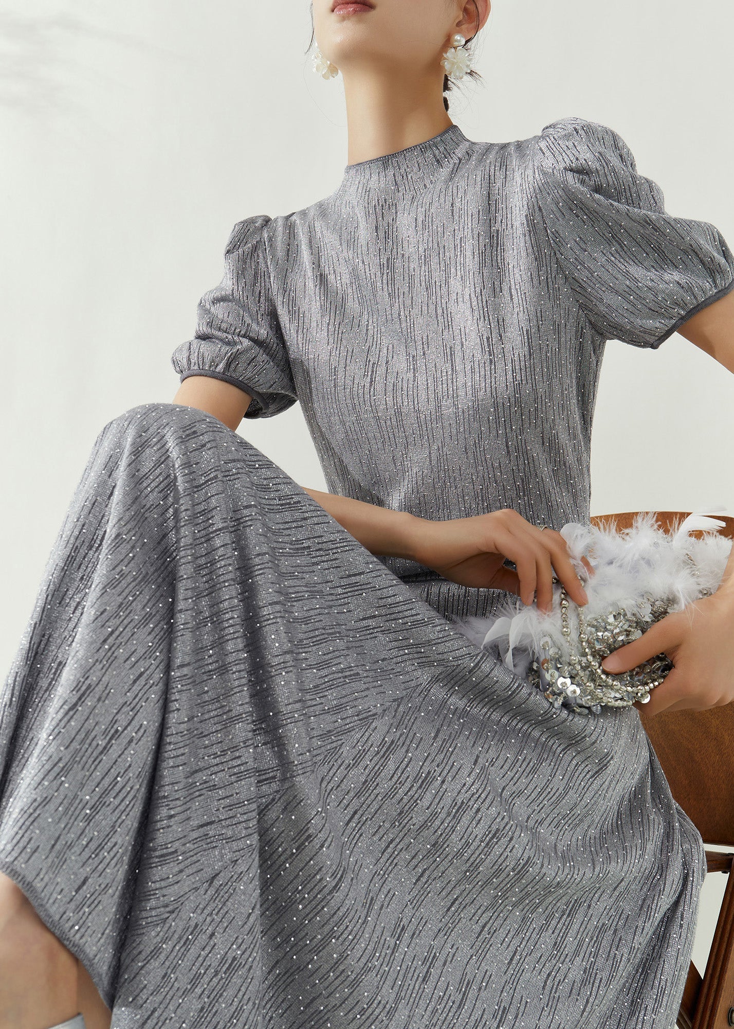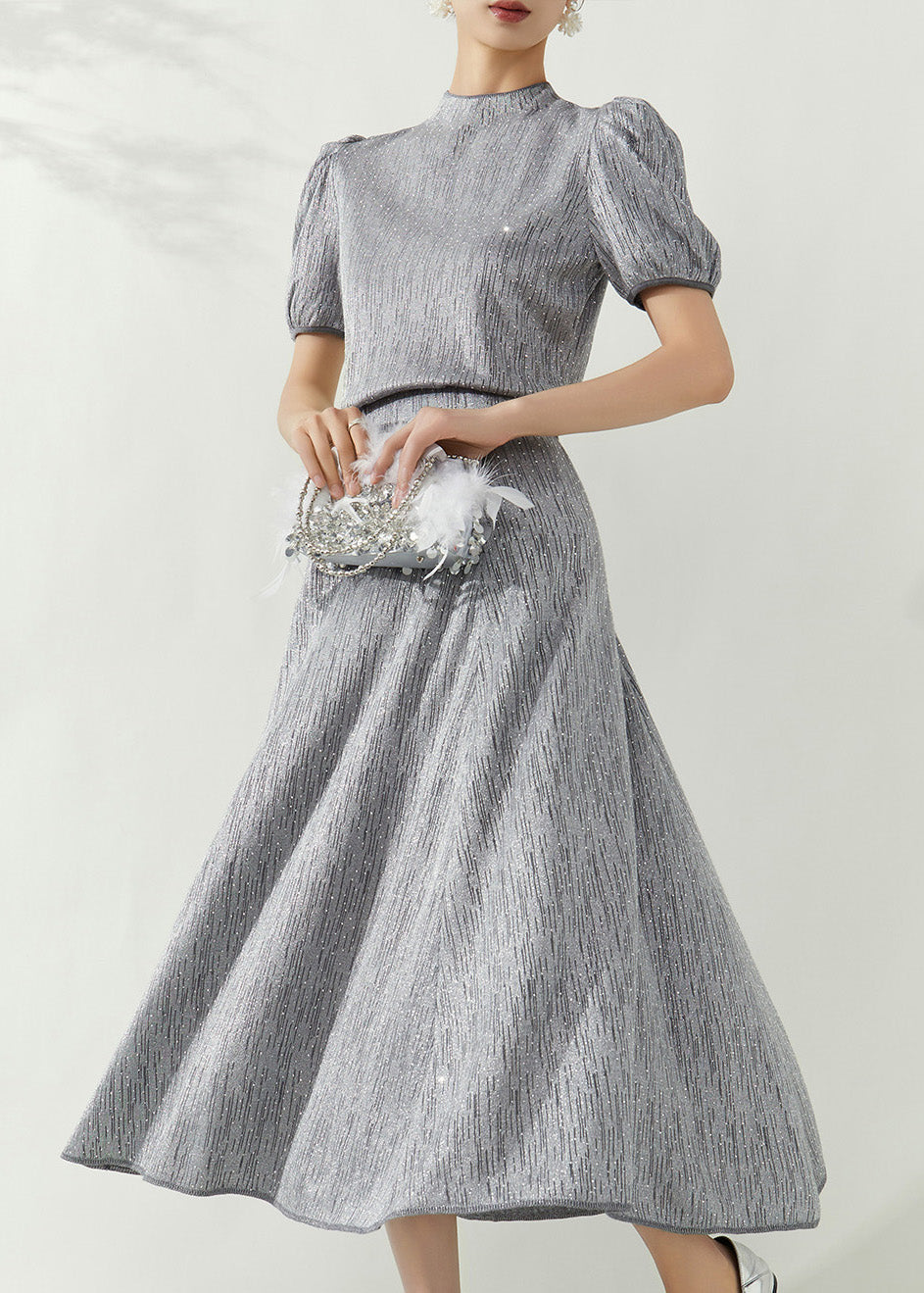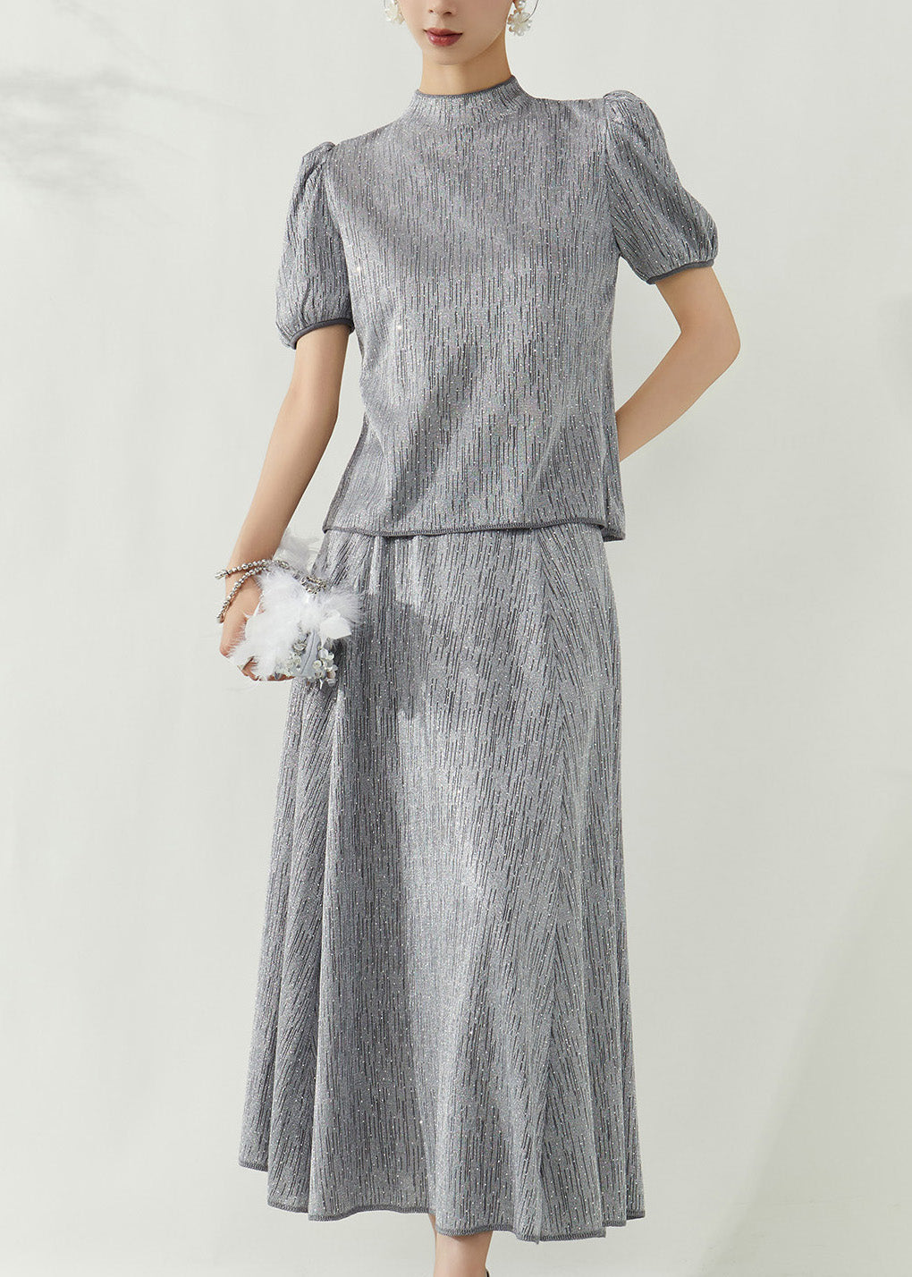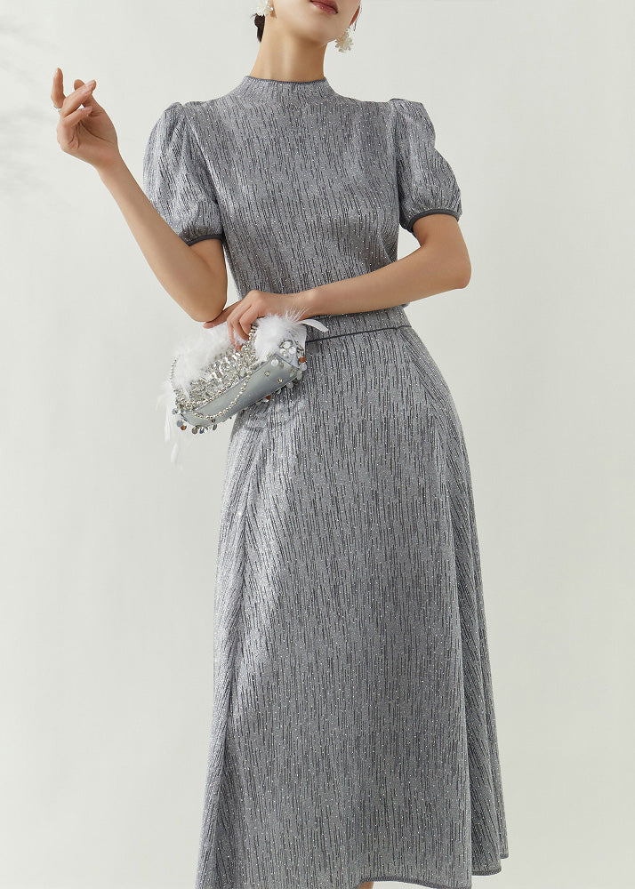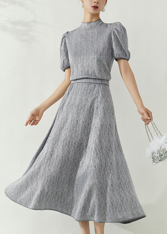 Elegant Grey Turtleneck Top And Maxi Skirts Two Pieces Set Puff Sleeve