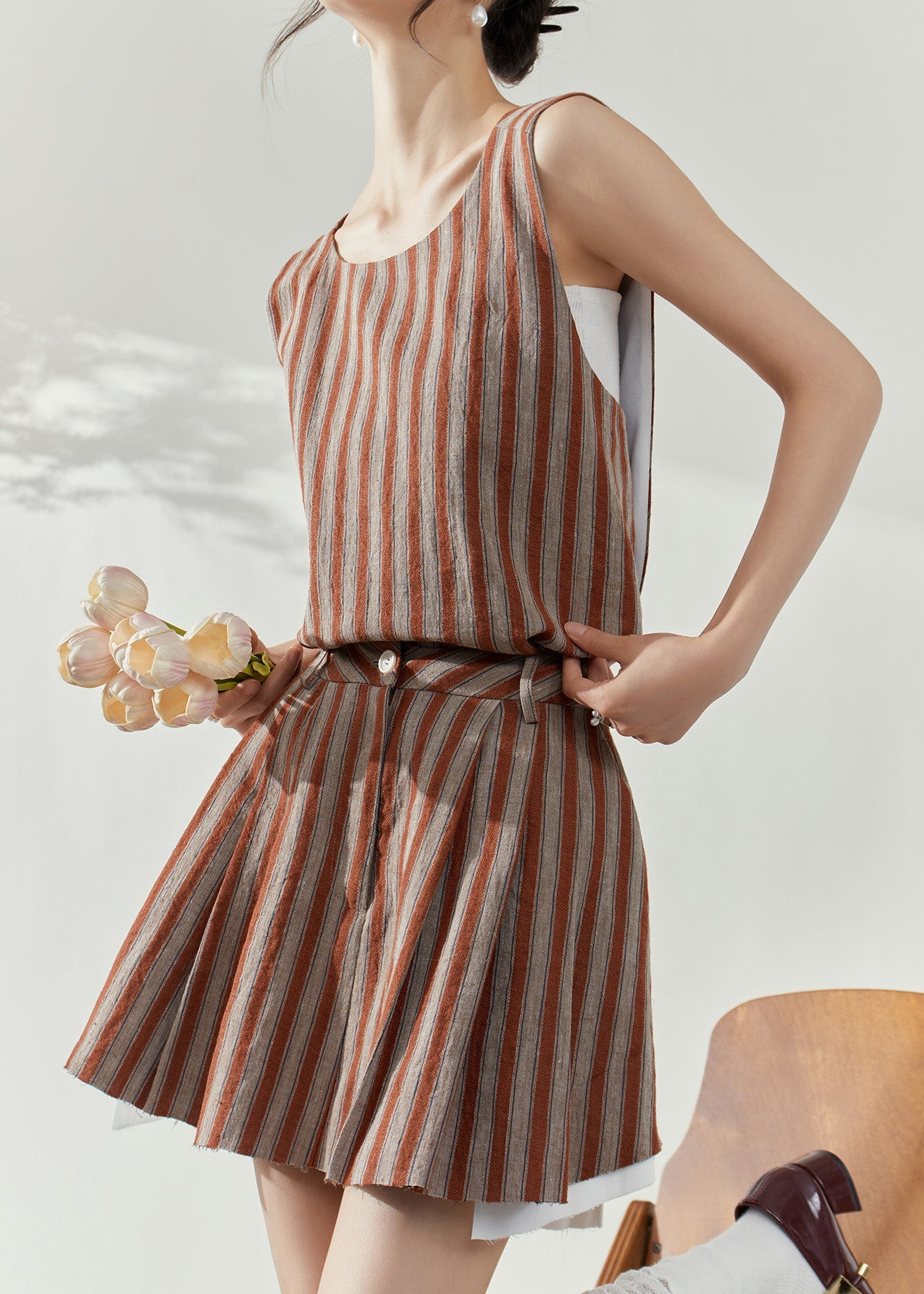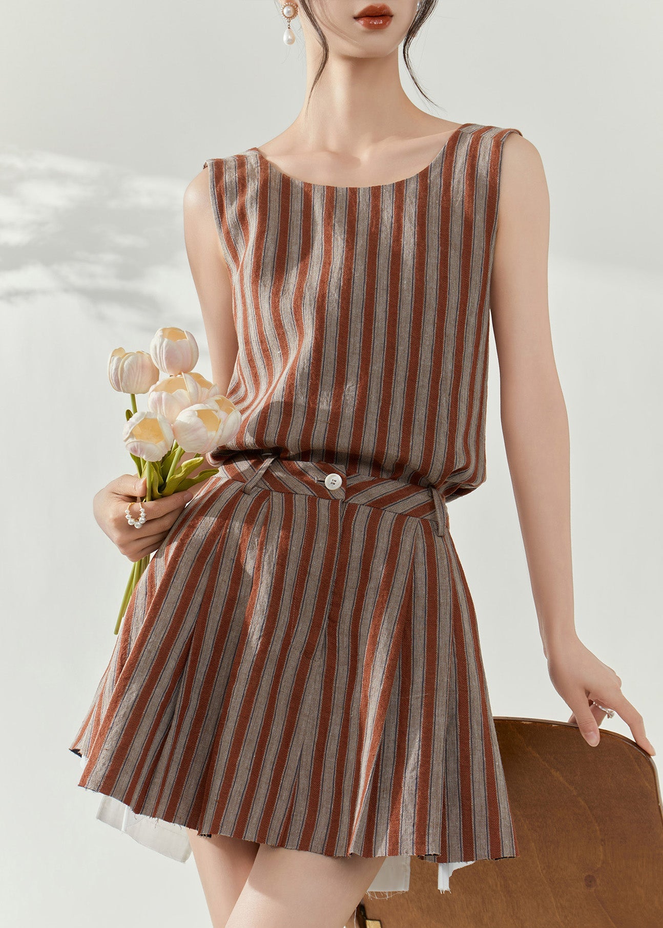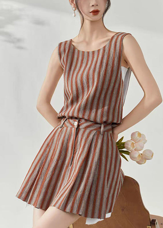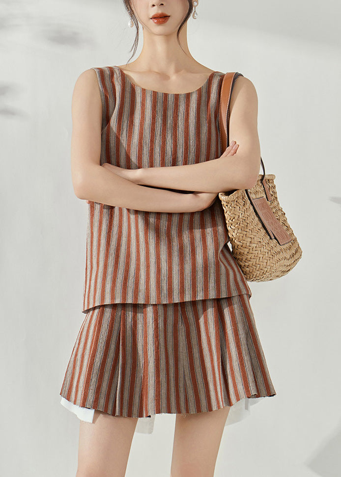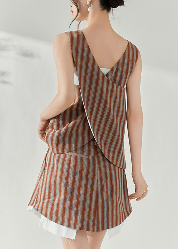 Fashion Brown Striped Cotton Top And Skirts Two-Piece Set Summer