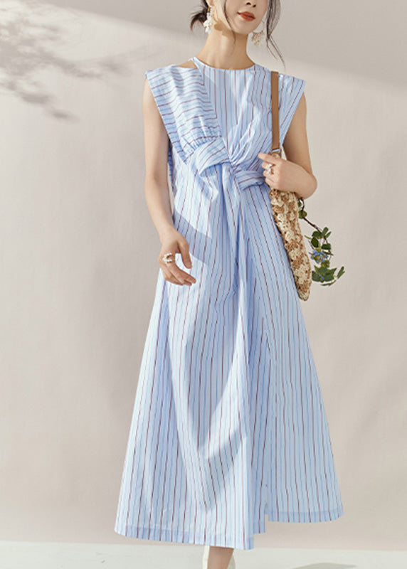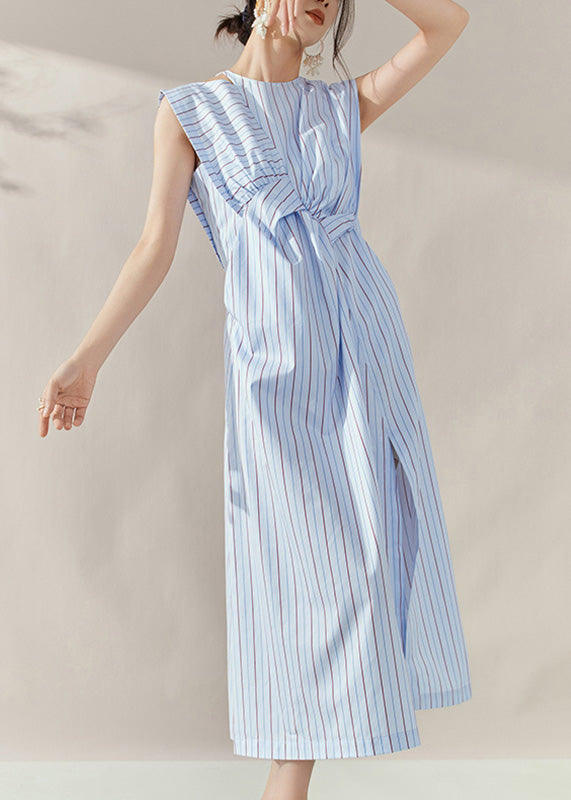 Fine Blue Striped Asymmetrical Side Open Long Dress Summer