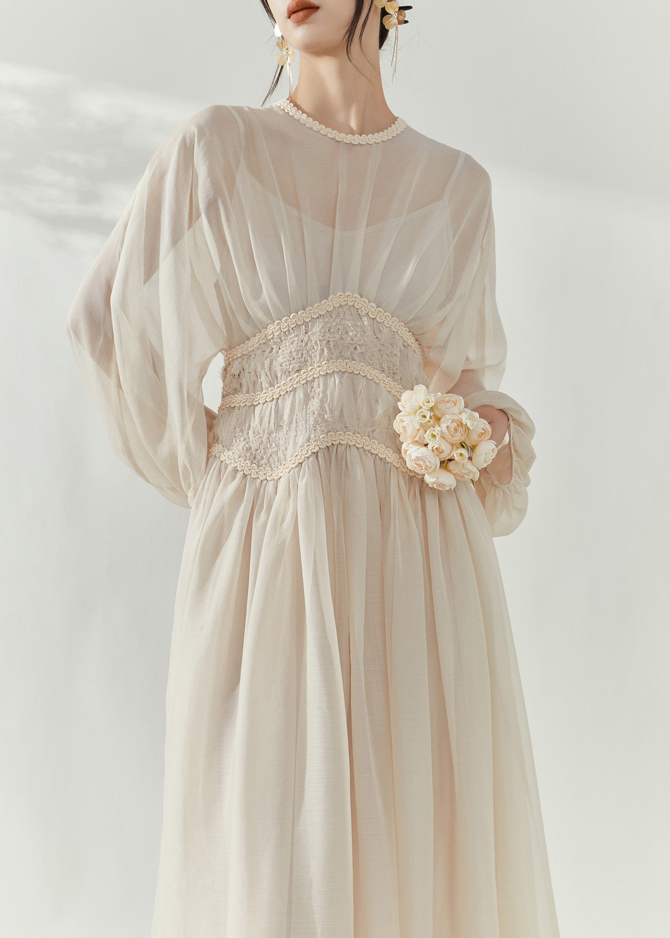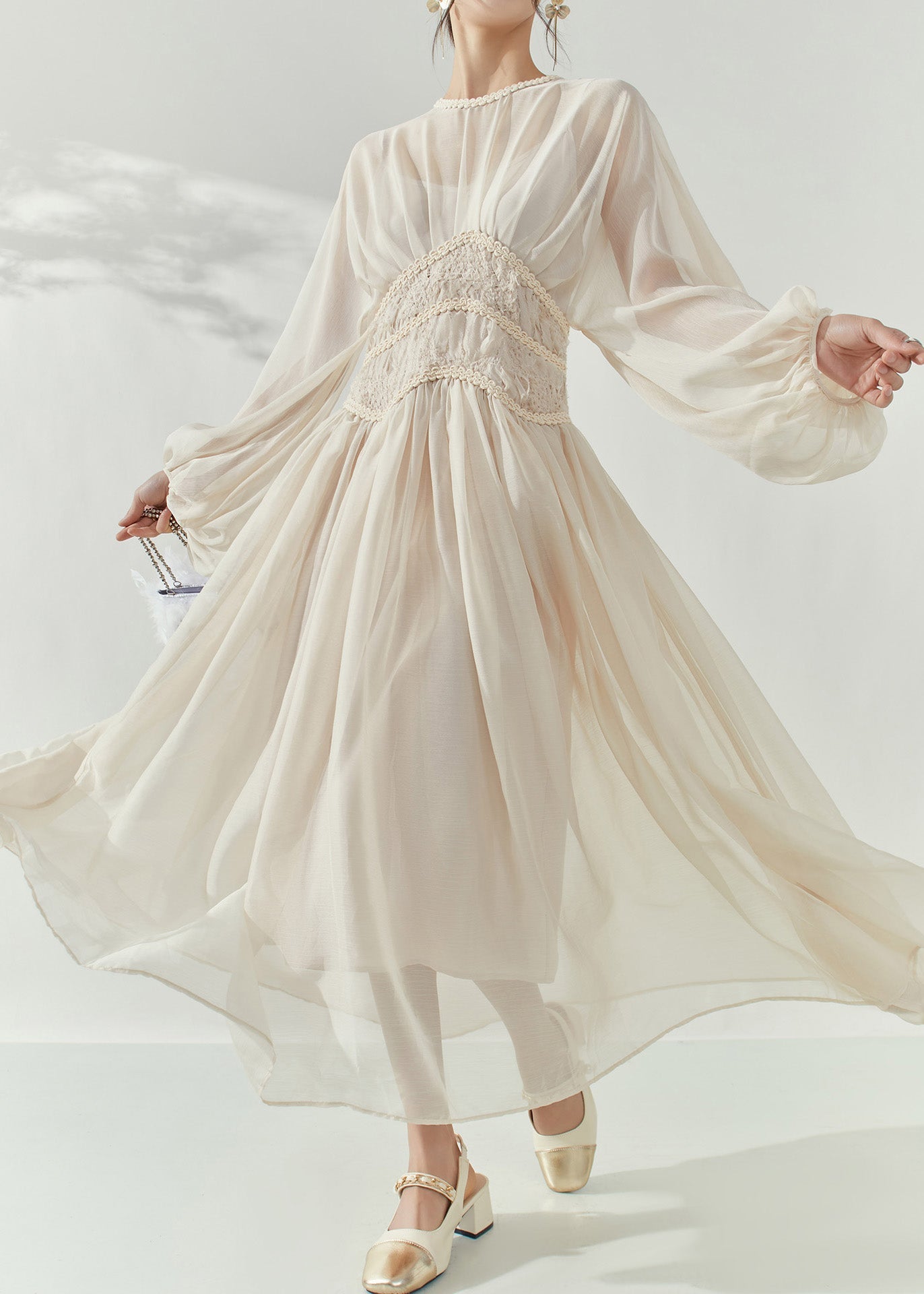 French Beige O-Neck Tunic Tulle Long Dresses Lantern Sleeve