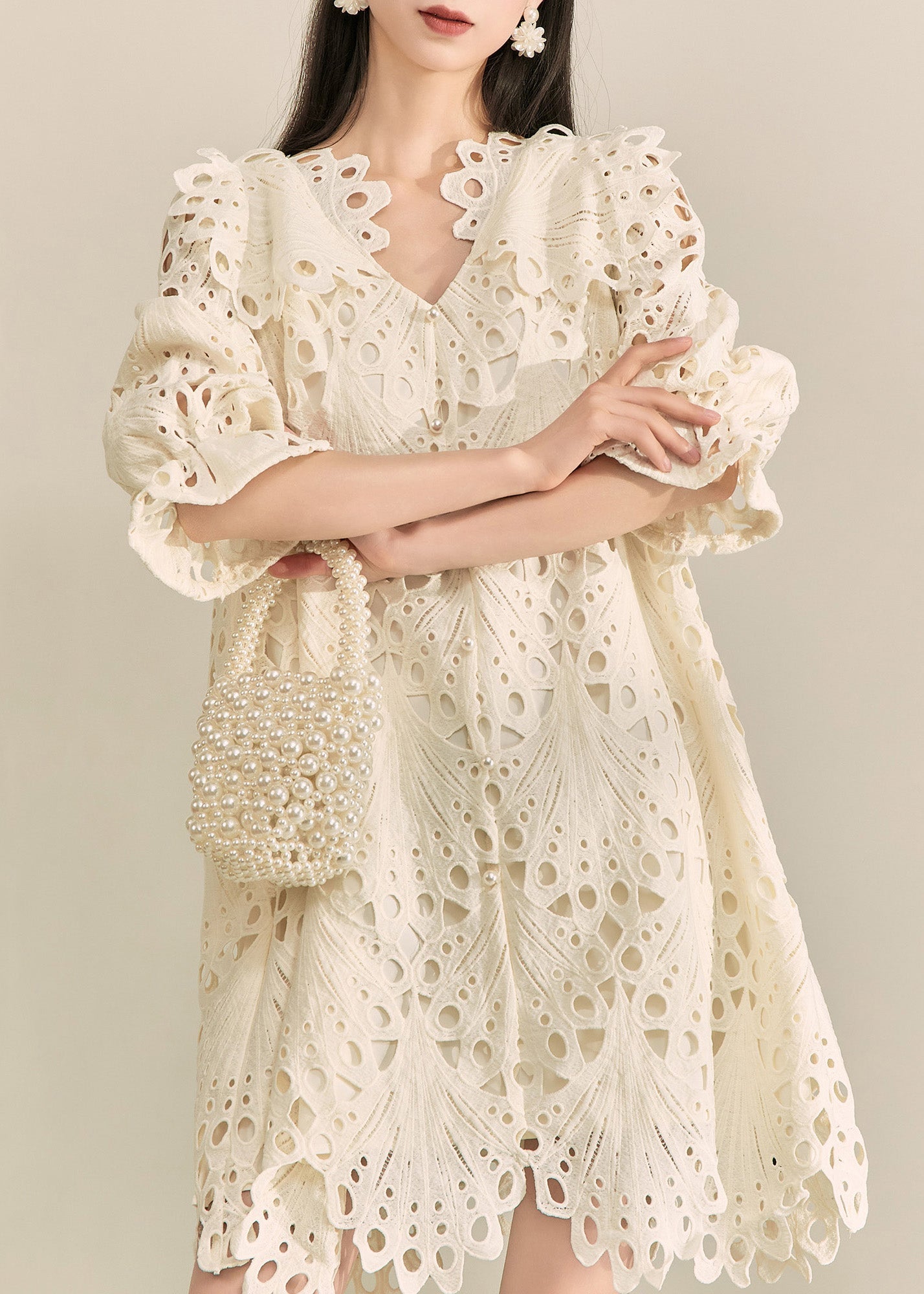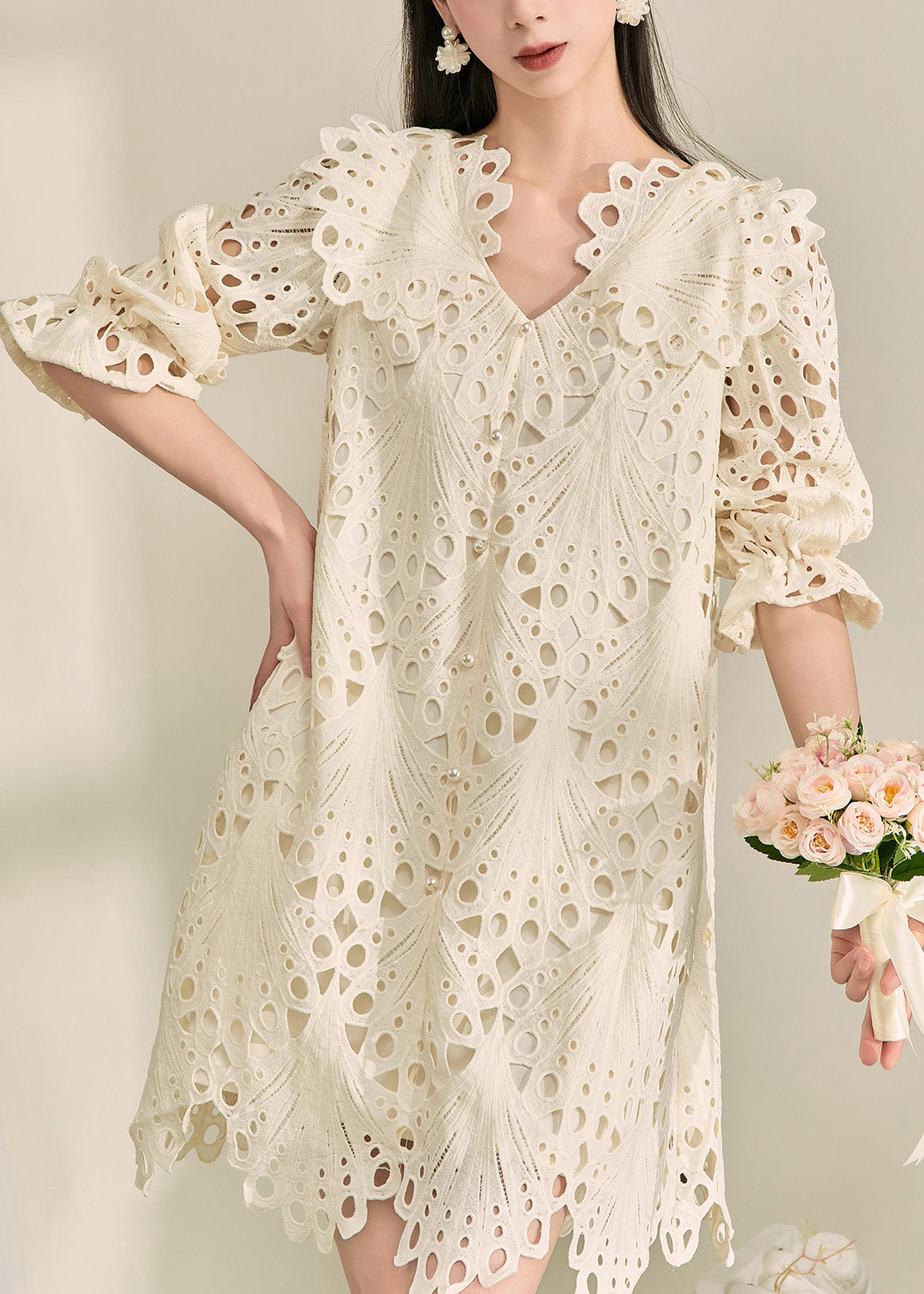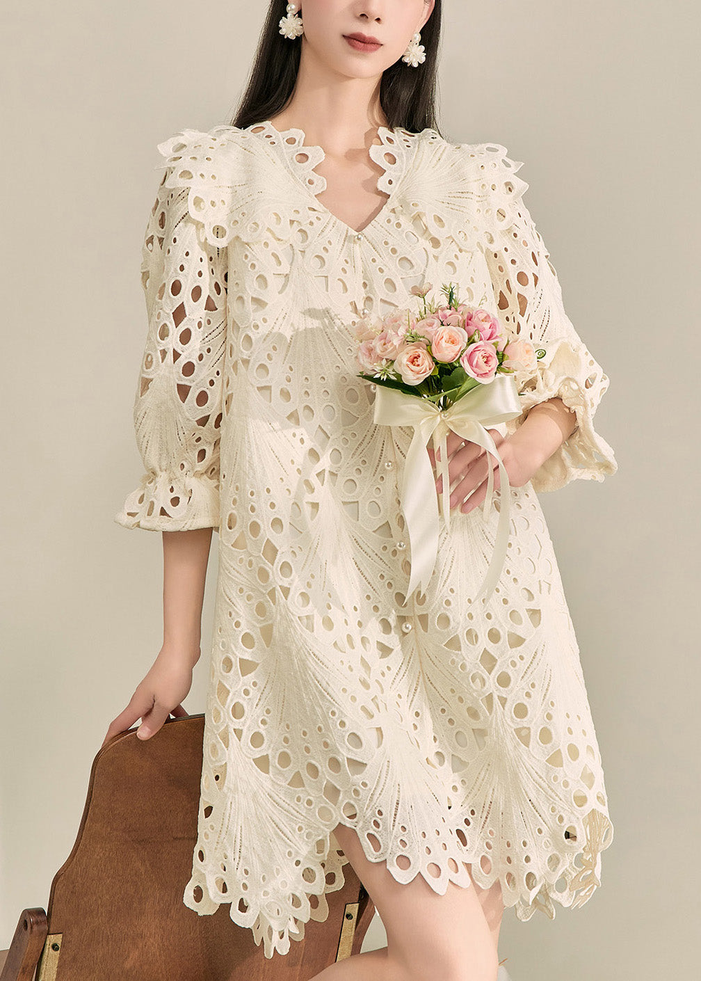 French White V Neck Hollow Out Holiday Mid Dress Fall