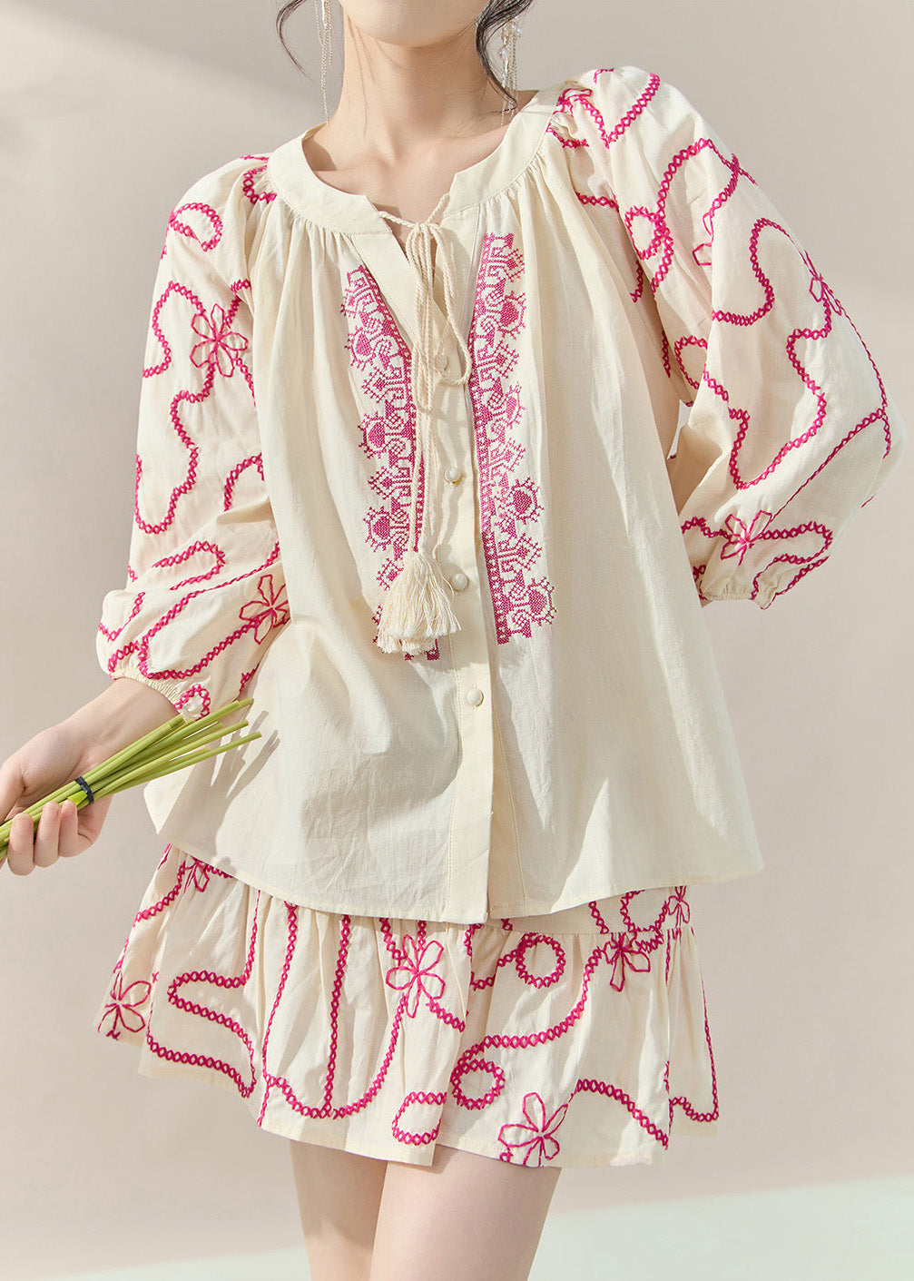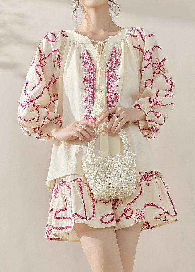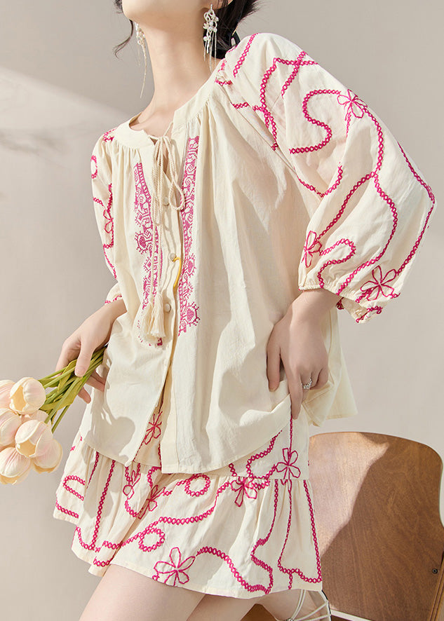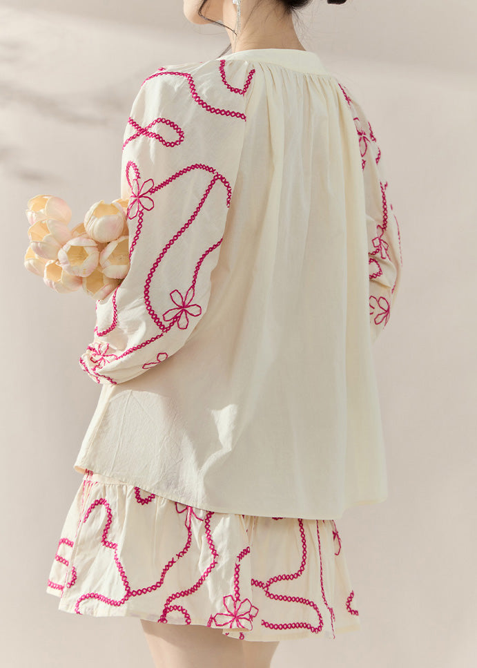 Natural Apricot O-Neck Embroidered Top And Skirts Two-Piece Set Fall