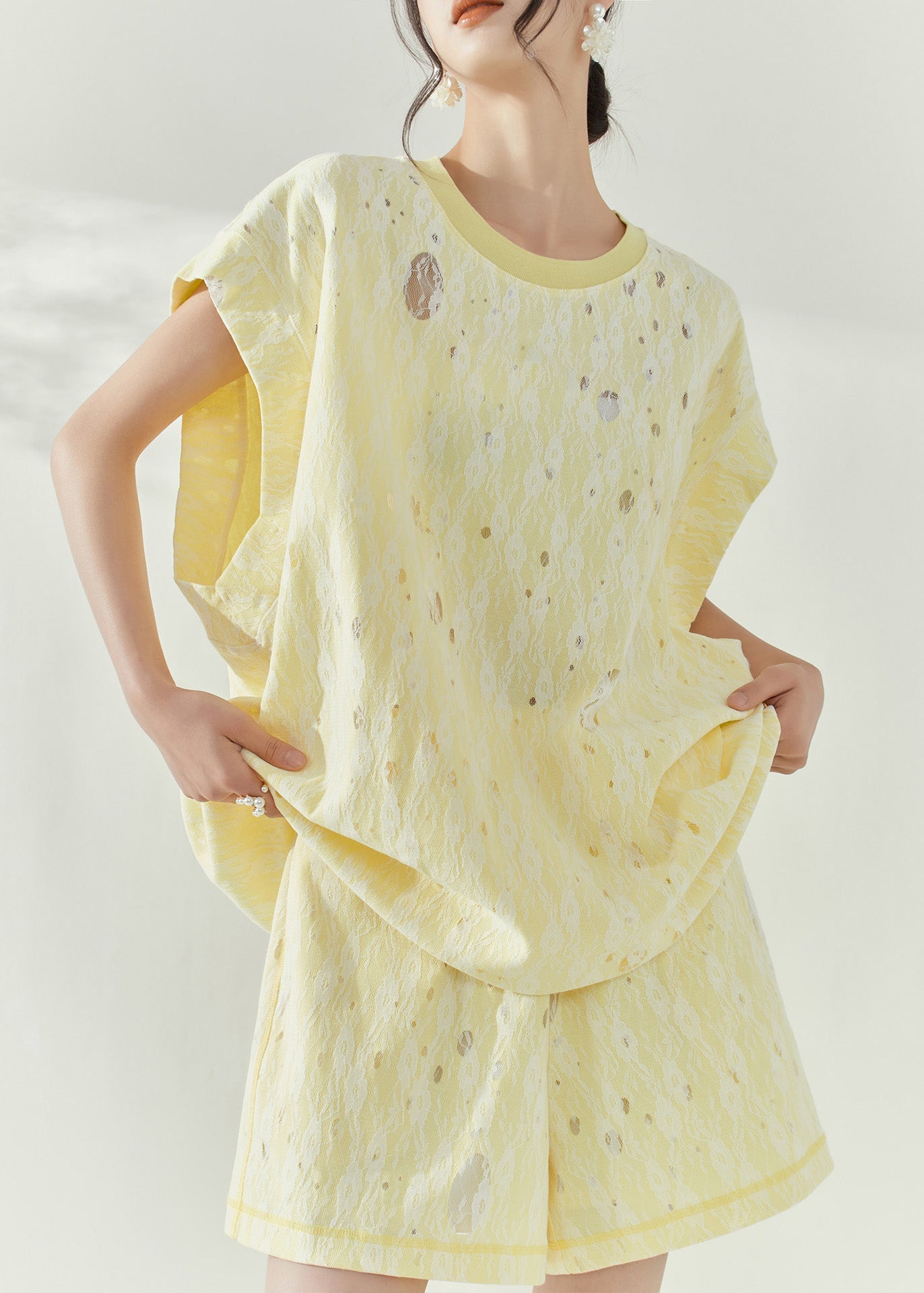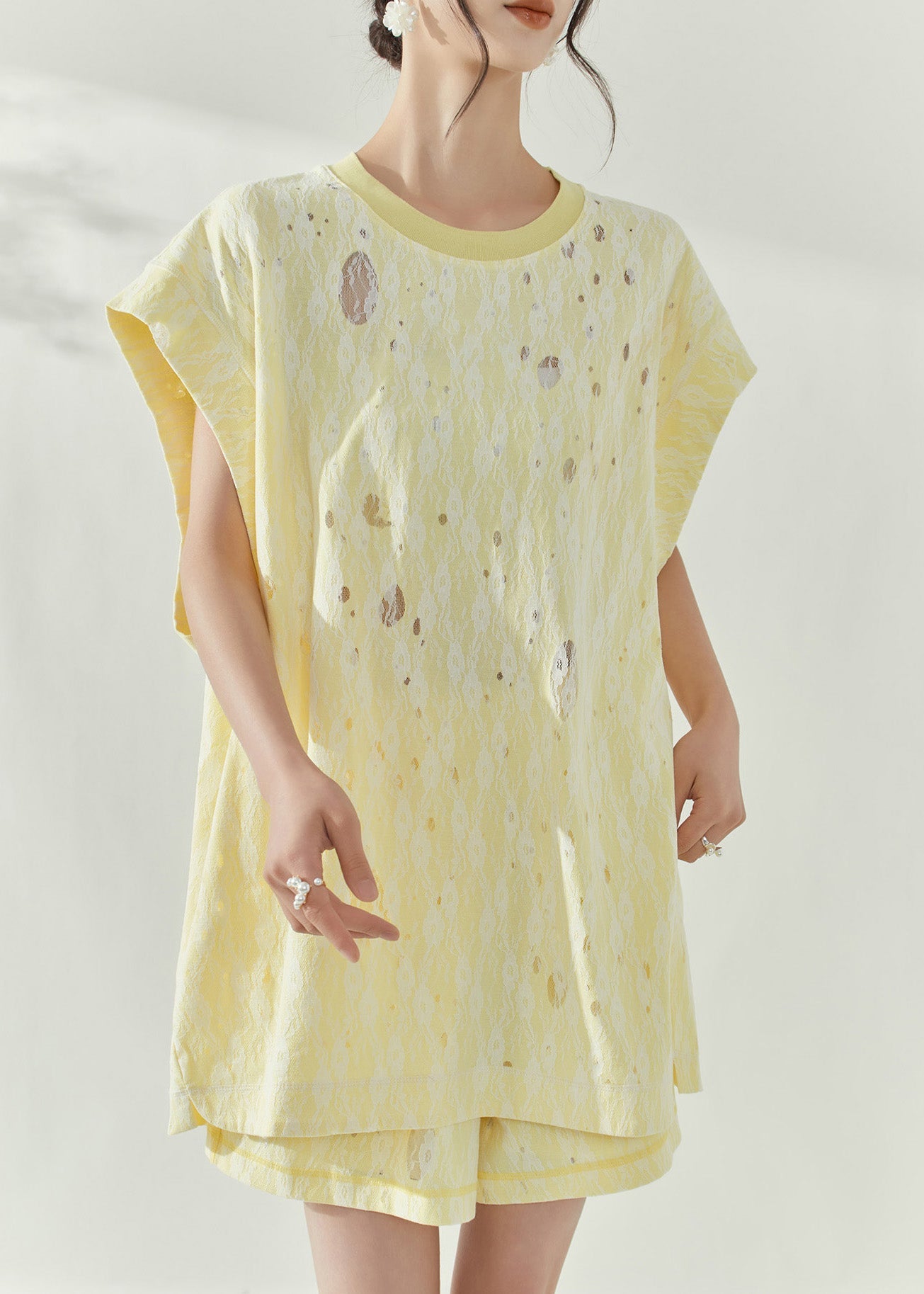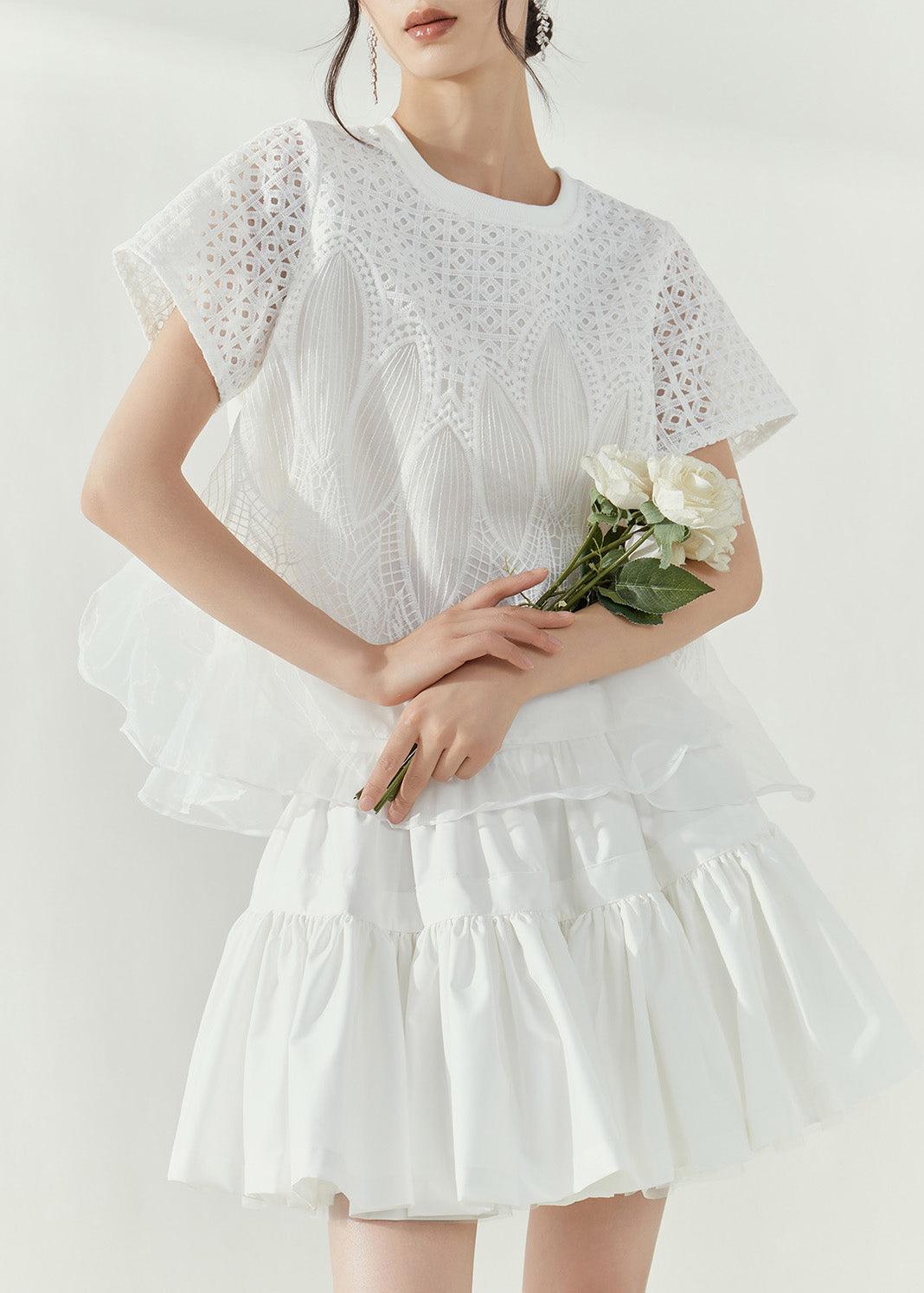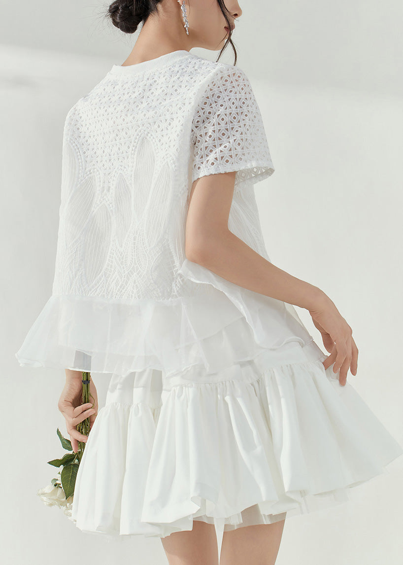 Simple White O-Neck Hollow Out Tulle Patchwork Top Short Sleeve