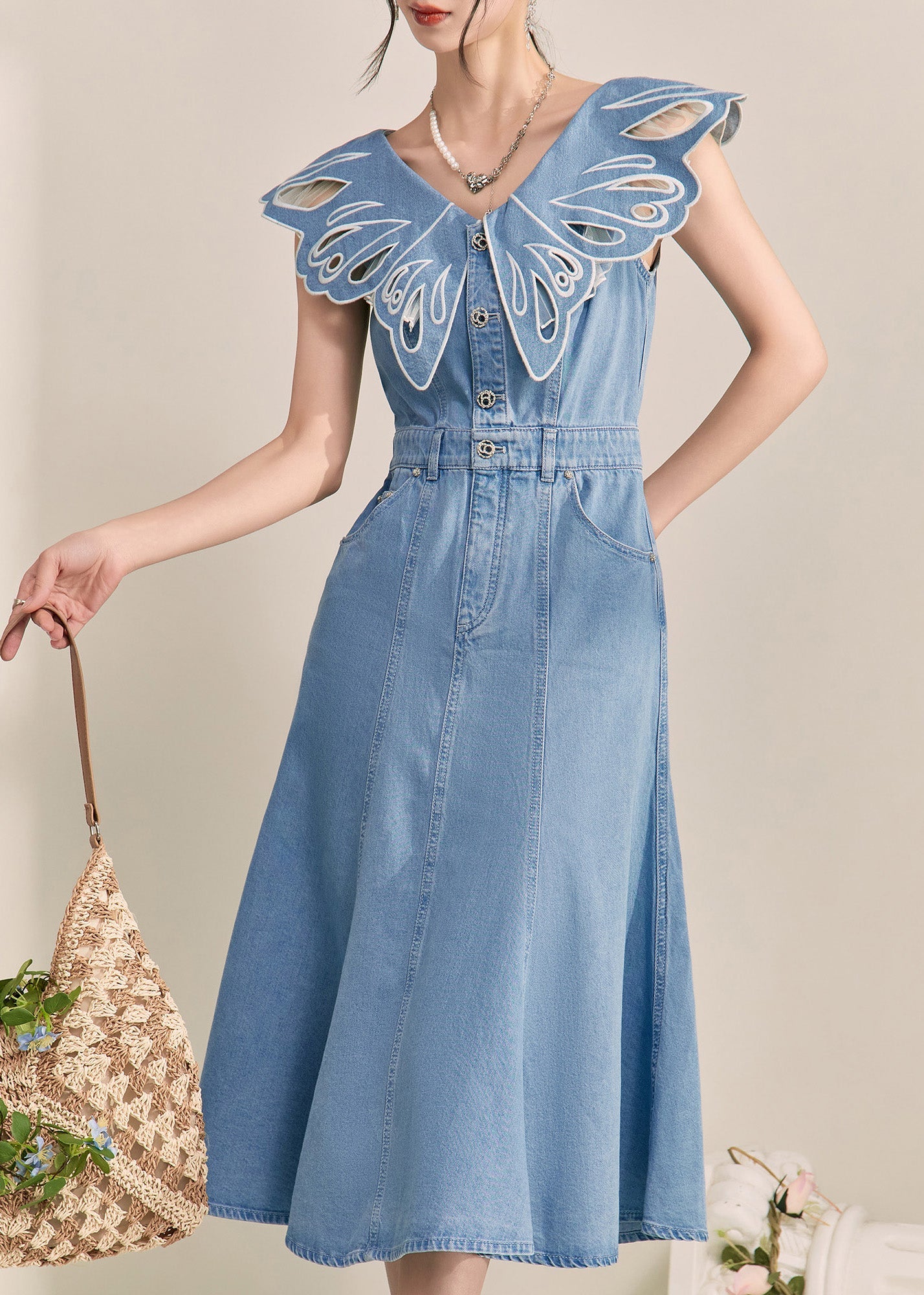 Unique Blue Patchwork Hollow Out Denim Maxi Dress Short Sleeve