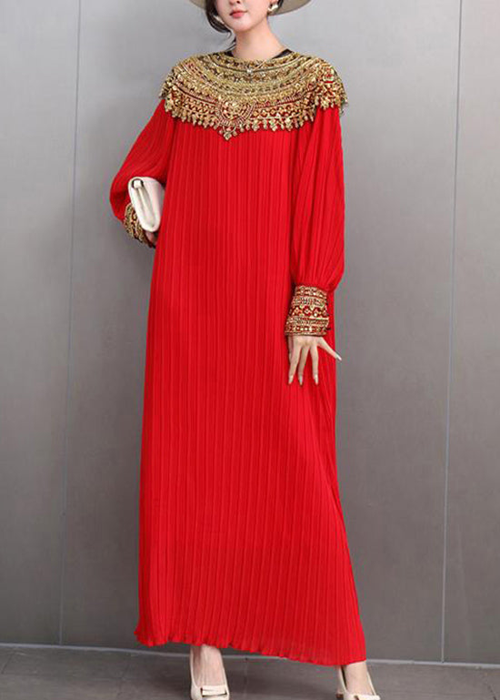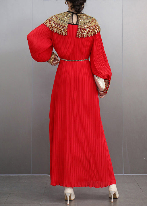 Haute Couture Moment Red Pleated Gown Gold Accents Autumn