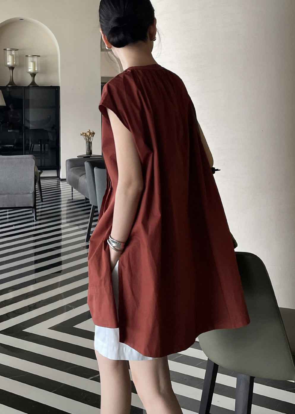 Cute Terracotta Comfortable Fabric Pleated Shirt Sleeveless