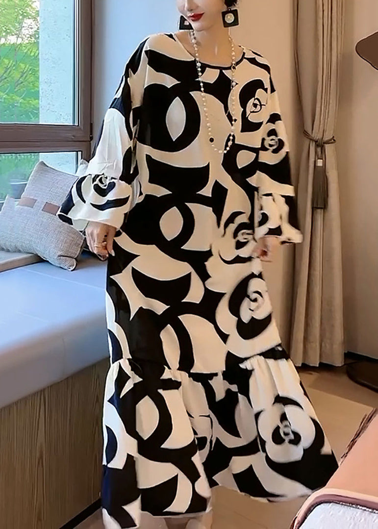 Elegant And Lazy Style Black And White Contrast Large Flower Floral Pattern Satin Texture Dress Flare Sleeve