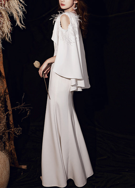 French White Feathered Haute Couture Mermaid Gown Off The Shoulder