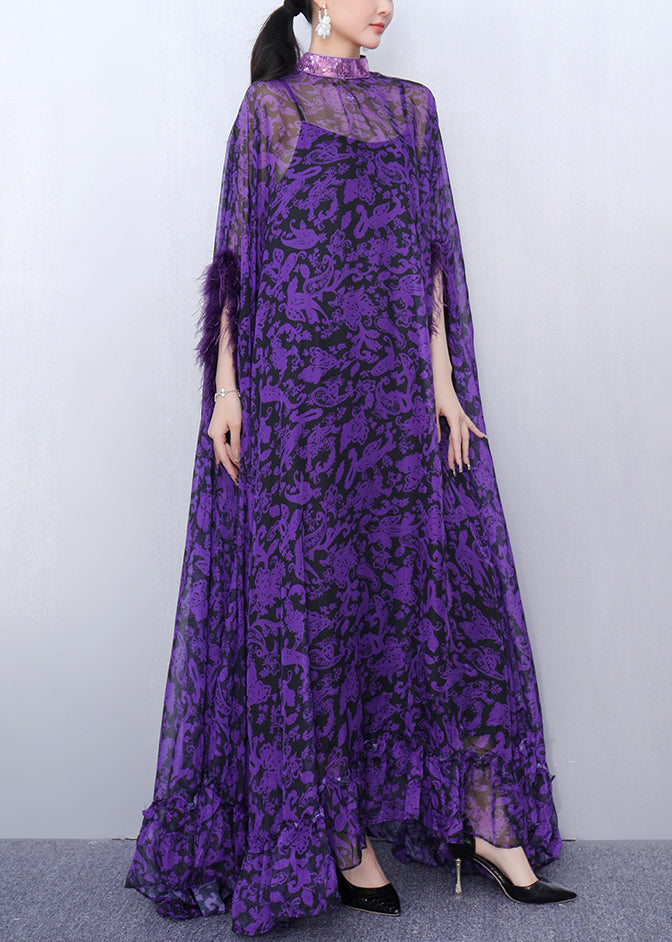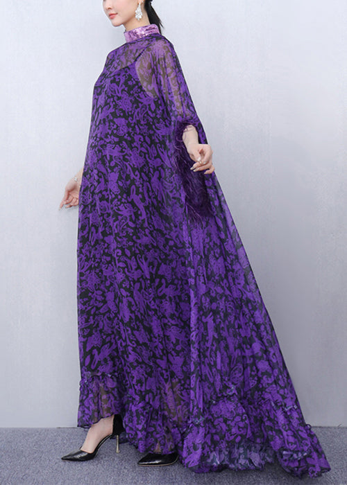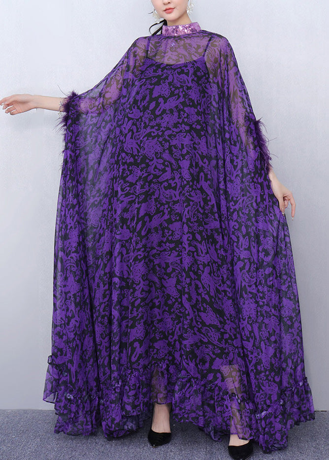 Luxurious Purple Print Patchwork Chiffon Two Pieces Set Half Sleeve