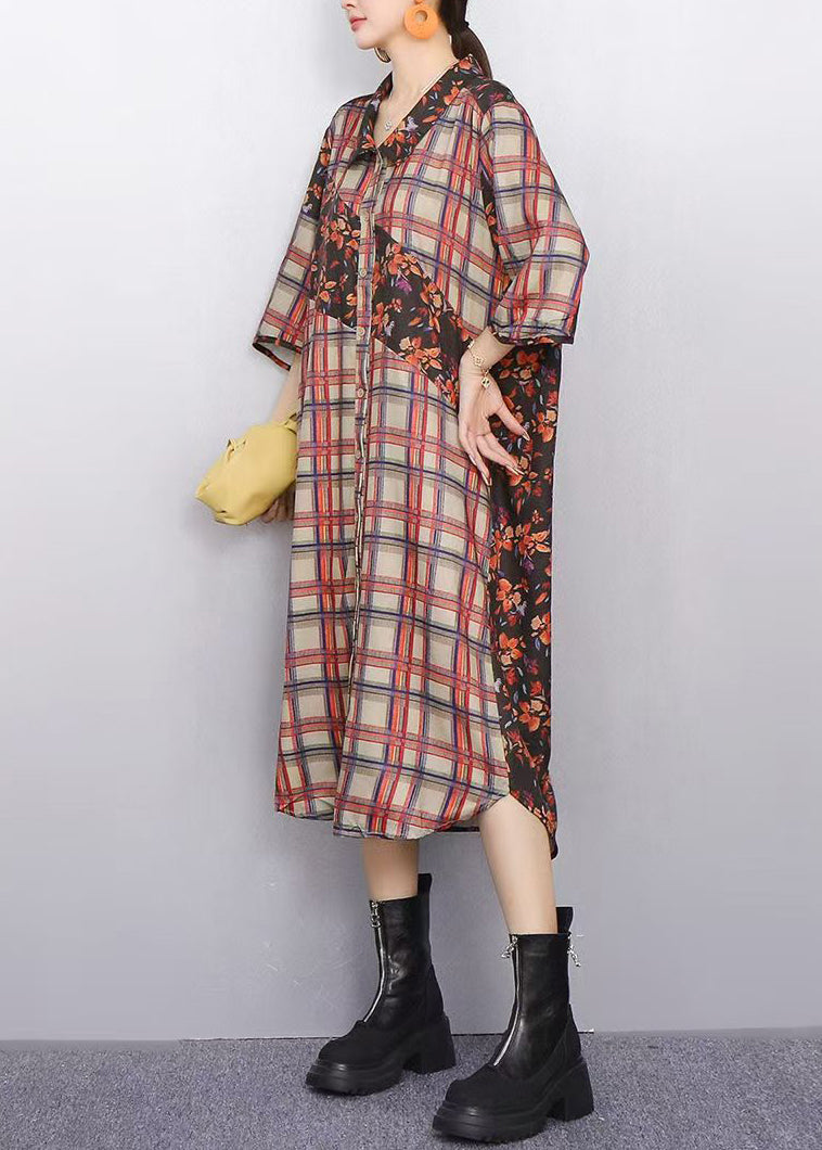 Modern Plaid Flower Patchwork Chiffon Shirt Dress Bracelet Sleeve