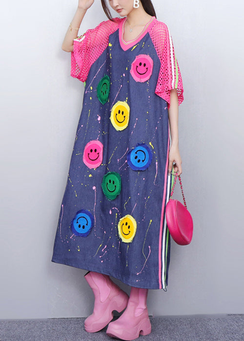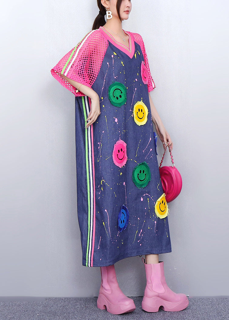Playful Pink Smiley Hollow Out Patchwork Denim Long Dress Summer